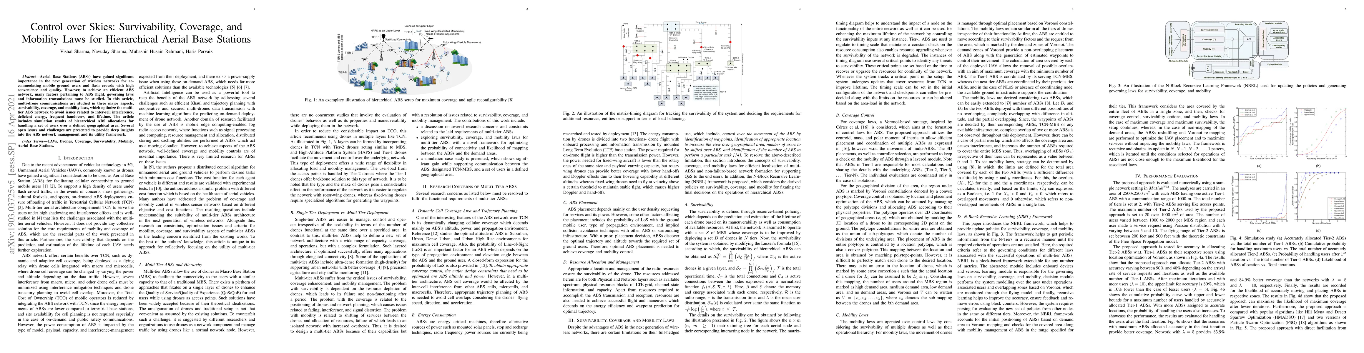 This paper explores the optimization of multi-drone Aerial Base Stations (ABSs) in terms of survivability, coverage, and mobility laws to enhance network efficiency and user experience. Simulation results demonstrate hierarchical ABS allocations for managing user demands, while also highlighting challenges and open issues in ABS network management.