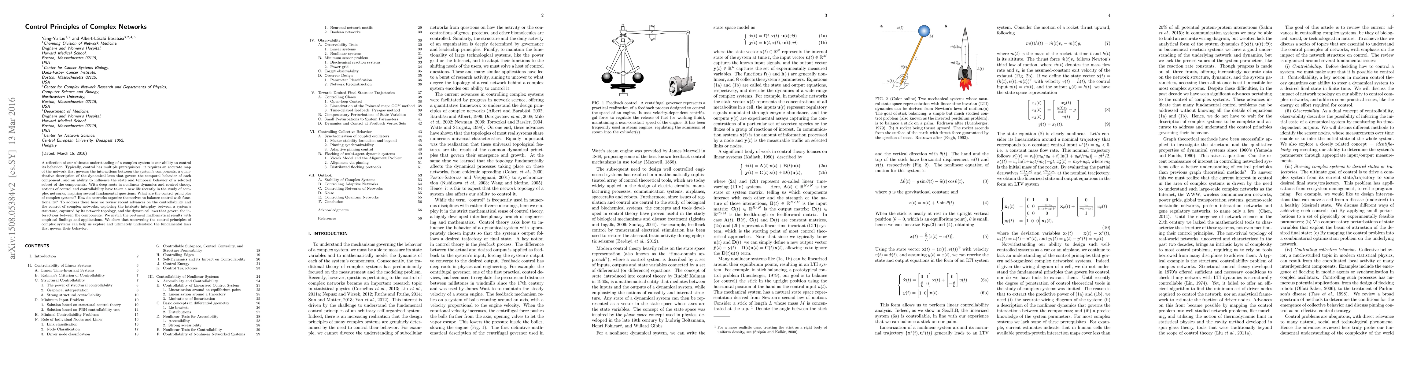 A reflection of our ultimate understanding of a complex system is our ability to control its behavior. Typically, control has multiple prerequisites: It requires an accurate map of the network that governs the interactions between the system's components, a quantitative description of the dynamical laws that govern the temporal behavior of each component, and an ability to influence the state and temporal behavior of a selected subset of the components. With deep roots in nonlinear dynamics and control theory, notions of control and controllability have taken a new life recently in the study of complex networks, inspiring several fundamental questions: What are the control principles of complex systems? How do networks organize themselves to balance control with functionality? To address these here we review recent advances on the controllability and the control of complex networks, exploring the intricate interplay between a system's structure, captured by its network topology, and the dynamical laws that govern the interactions between the components. We match the pertinent mathematical results with empirical findings and applications. We show that uncovering the control principles of complex systems can help us explore and ultimately understand the fundamental laws that govern their behavior.