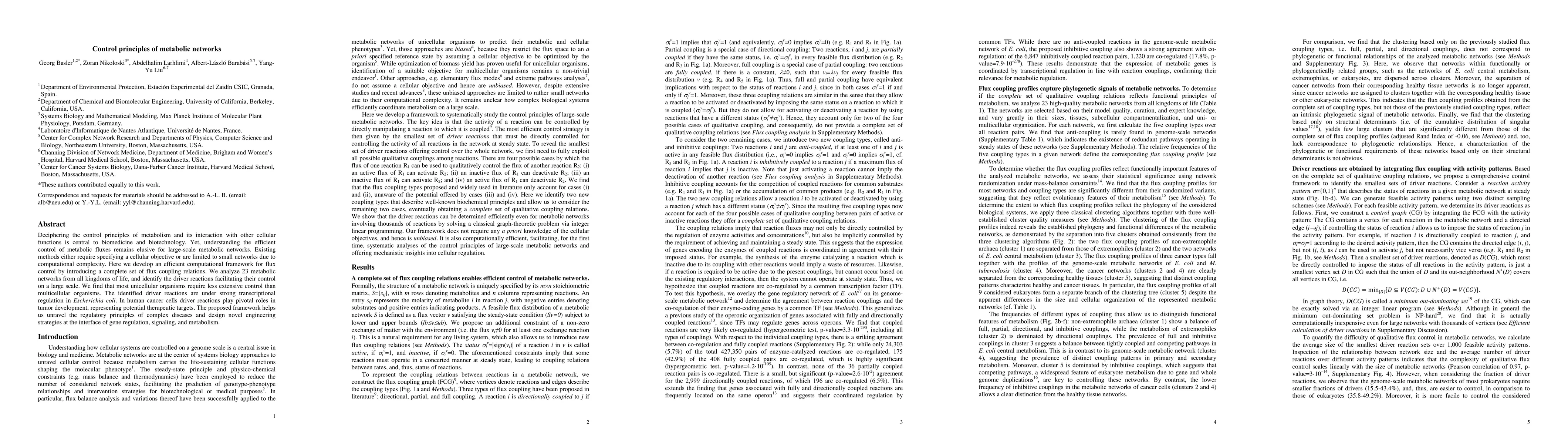 Deciphering the control principles of metabolism and its interaction with other cellular functions is central to biomedicine and biotechnology. Yet, understanding the efficient control of metabolic fluxes remains elusive for large-scale metabolic networks. Existing methods either require specifying a cellular objective or are limited to small networks due to computational complexity. Here we develop an efficient computational framework for flux control by introducing a complete set of flux coupling relations. We analyze 23 metabolic networks from all kingdoms of life, and identify the driver reactions facilitating their control on a large scale. We find that most unicellular organisms require less extensive control than multicellular organisms. The identified driver reactions are under strong transcriptional regulation in Escherichia coli. In human cancer cells driver reactions play pivotal roles in tumor development, representing potential therapeutic targets. The proposed framework helps us unravel the regulatory principles of complex diseases and design novel engineering strategies at the interface of gene regulation, signaling, and metabolism.