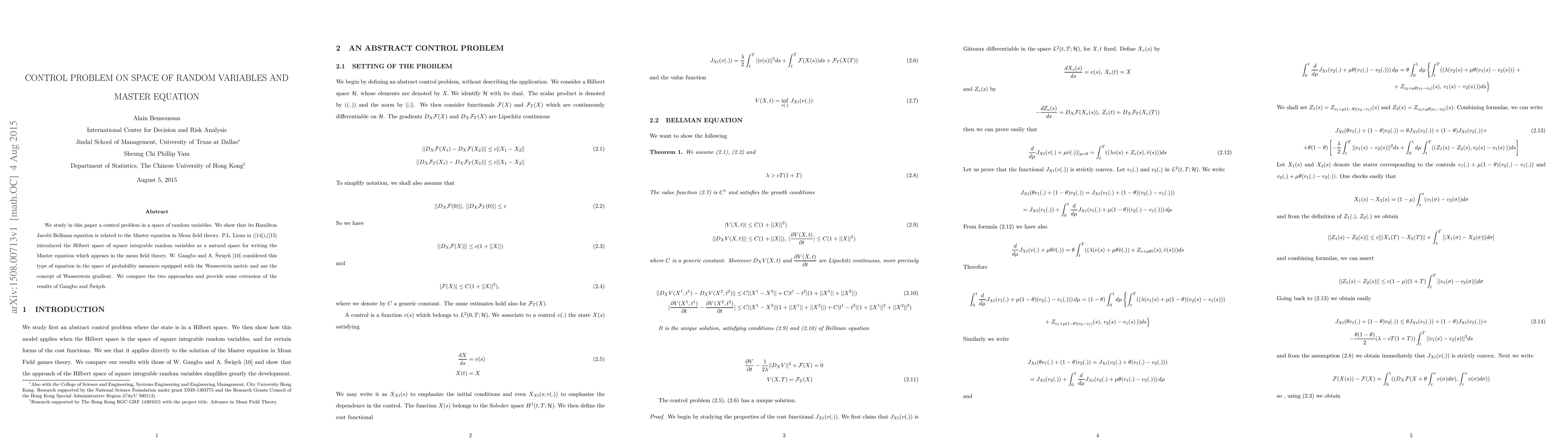 We study in this paper a control problem in a space of random variables. We show that its Hamilton Jacobi Bellman equation is related to the Master equation in Mean field theory. P.L. Lions in [14,15] introduced the Hilbert space of square integrable random variables as a natural space for writing the Master equation which appears in the mean field theory. W. Gangbo and A. \'Swi\k{e}ch [10] considered this type of equation in the space of probability measures equipped with the Wasserstein metric and use the concept of Wasserstein gradient. We compare the two approaches and provide some extension of the results of Gangbo and \'Swi\k{e}ch.