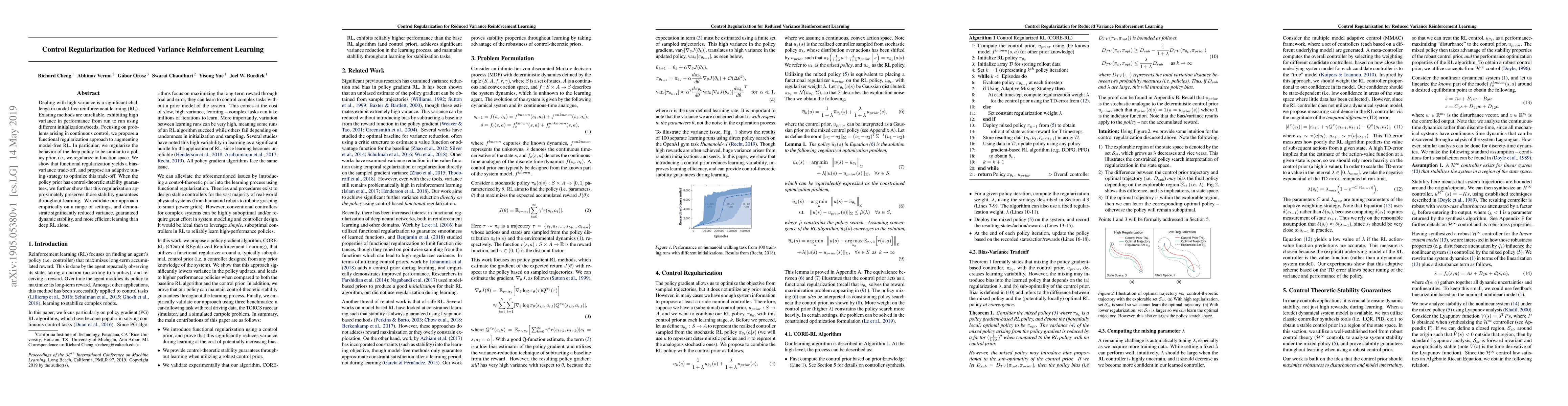 This paper proposes a functional regularization method to reduce variance in model-free reinforcement learning for continuous control tasks. The approach regularizes the deep policy to resemble a stable policy prior, achieving a bias-variance trade-off and demonstrating reduced variance, stability, and improved learning efficiency.