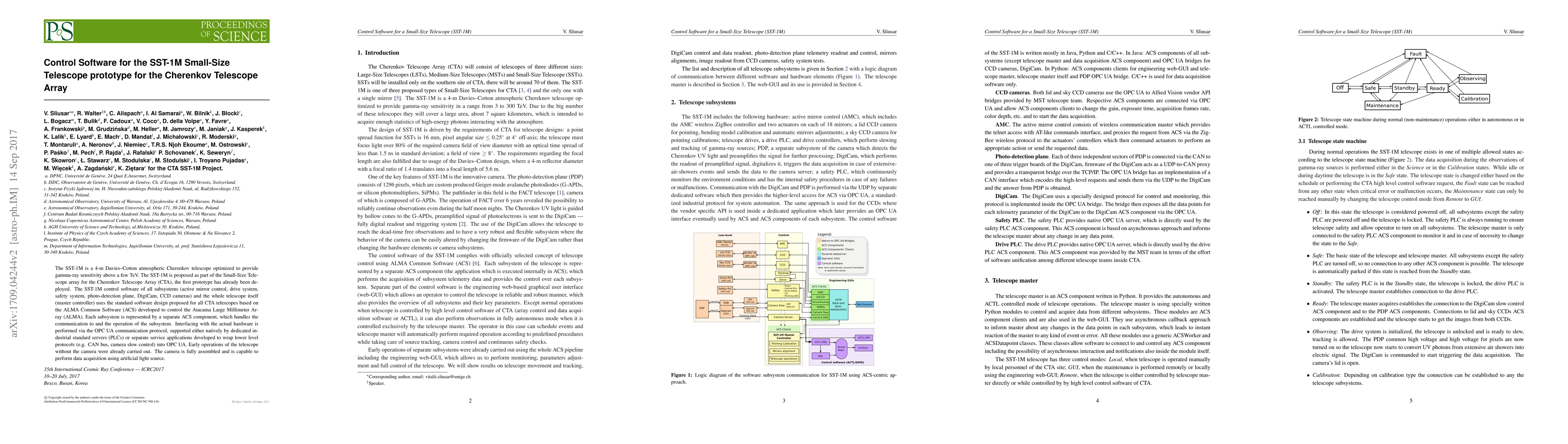 This paper details the control software for the SST-1M prototype telescope, part of the Cherenkov Telescope Array, which uses the ALMA Common Software (ACS) for managing subsystems and communication via OPC UA. Early operations have been successful without the camera, which is now fully assembled and ready for data acquisition.