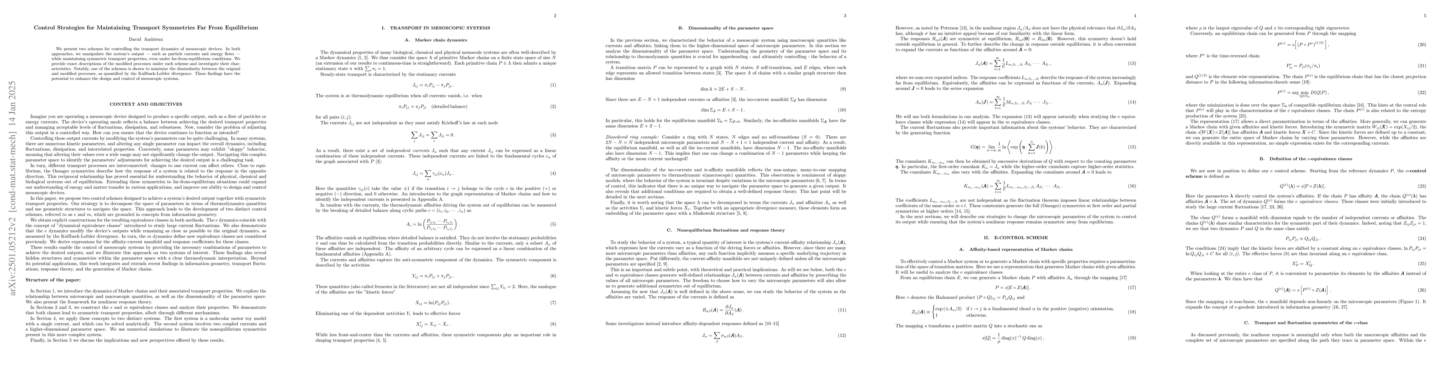 This paper proposes two control strategies to maintain transport symmetries in mesoscopic devices far from equilibrium, ensuring symmetric transport properties. One scheme minimizes the divergence between original and modified processes, offering potential improvements in mesoscopic system design and control.