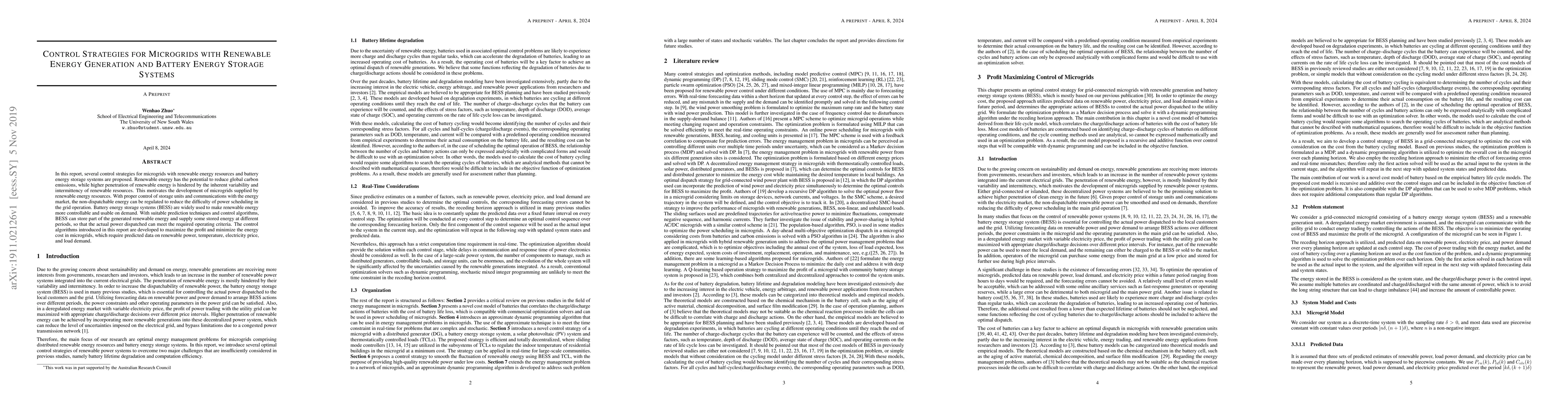 In this report, several control strategies for microgrids with renewable energy resources and battery energy storage systems are proposed. Renewable energy has the potential to reduce global carbon emissions, while higher penetration of renewable energy is hindered by the inherent variability and intermittency of renewable resources. This motivates the development of microgrids supplied by renewable energy resources. With proper control of storage units and communications with the energy market, the non-dispatchable energy can be regulated to reduce the difficulty of power scheduling in the grid operation. Battery energy storage systems (BESS) are widely used to make renewable energy more controllable and usable on demand. With suitable prediction techniques and control algorithms, BESS can store part of the generated renewable energy and supply some stored energy at different periods, so that the actual power dispatched can meet the required operating criteria. The control algorithms introduced in this report are developed to maximize the profit and minimize the energy cost in microgrids, which require predicted data on renewable power, temperature, electricity price, and load demand.