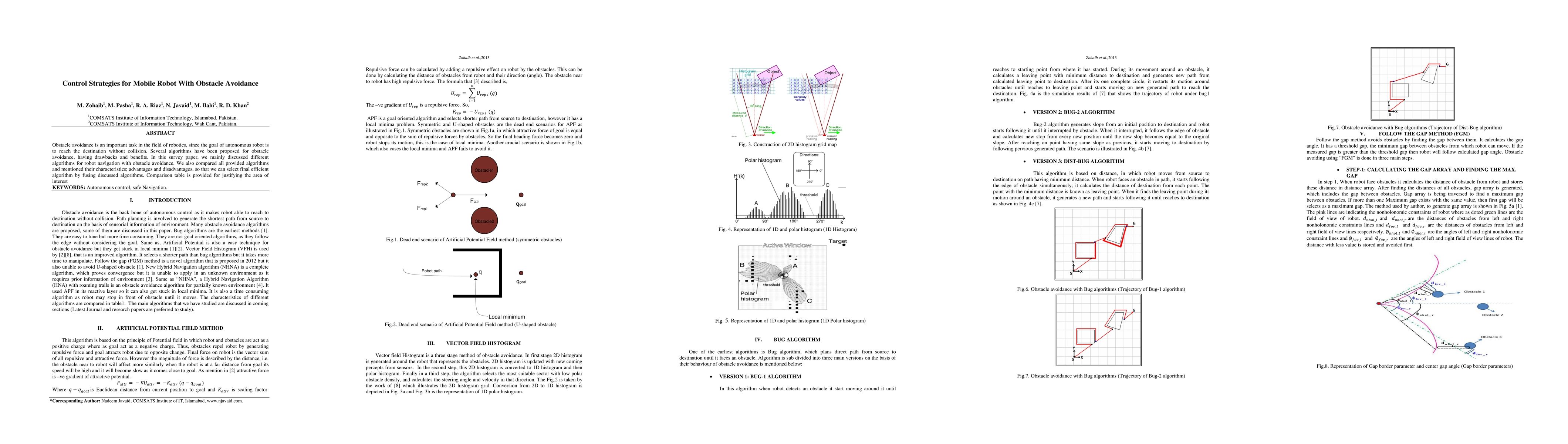 Obstacle avoidance is an important task in the field of robotics, since the goal of autonomous robot is to reach the destination without collision. Several algorithms have been proposed for obstacle avoidance, having drawbacks and benefits. In this survey paper, we mainly discussed different algorithms for robot navigation with obstacle avoidance. We also compared all provided algorithms and mentioned their characteristics; advantages and disadvantages, so that we can select final efficient algorithm by fusing discussed algorithms. Comparison table is provided for justifying the area of interest