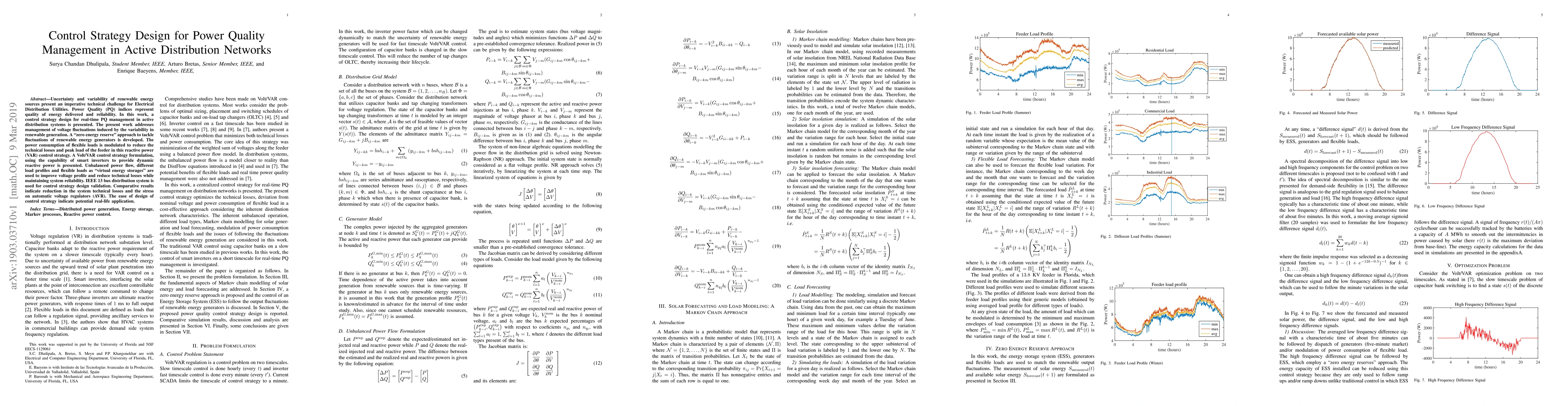 Uncertainty and variability of renewable energy sources present an imperative technical challenge for Electrical Distribution Utilities. Power Quality indices represent quality of energy delivered and reliability. In this work, a control strategy design for real-time PQ management in active distribution systems is presented. The present work addresses management of voltage fluctuations induced by the variability in renewable generation. A zero energy reserve approach to tackle fluctuations of renewable energy generators is developed. The power consumption of flexible loads is modulated to reduce the technical losses and peak load of the feeder in this reactive power control strategy. A Volt VAR control strategy formulation, using the capability of smart inverters to provide dynamic reactive power is presented. Unbalanced power flow, different load profiles and flexible loads as virtual energy storages are used to improve voltage profile and reduce technical losses while maintaining system reliability. IEEE 13 bus distribution system is used for control strategy design validation. Comparative results indicate reduction in the system technical losses and the stress on automatic voltage regulators. The ease of design of control strategy indicate potential real-life application.