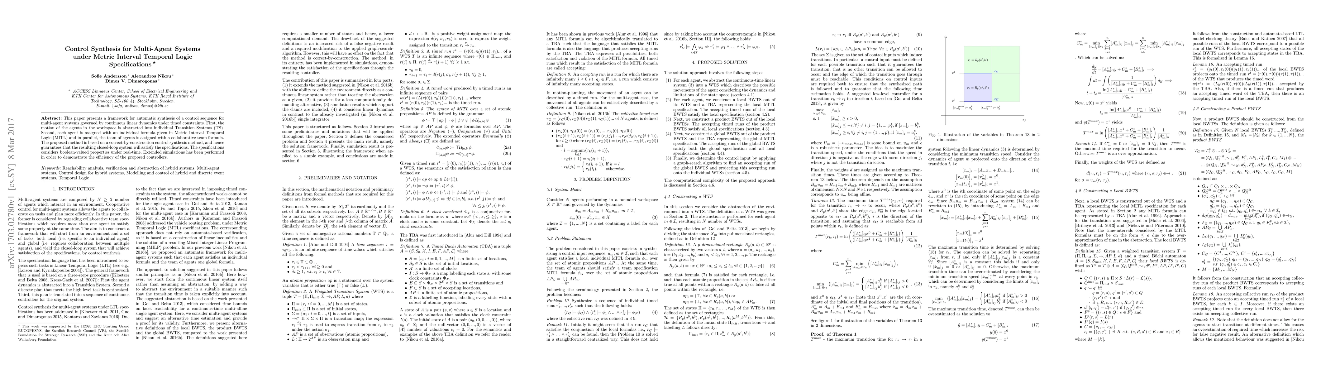 This paper presents a framework for automatic synthesis of a control sequence for multi-agent systems governed by continuous linear dynamics under timed constraints. First, the motion of the agents in the workspace is abstracted into individual Transition Systems (TS). Second, each agent is assigned with an individual formula given in Metric Interval Temporal Logic (MITL) and in parallel, the team of agents is assigned with a collaborative team formula. The proposed method is based on a correct-by-construction control synthesis method, and hence guarantees that the resulting closed-loop system will satisfy the specifications. The specifications considers boolean-valued properties under real-time. Extended simulations has been performed in order to demonstrate the efficiency of the proposed controllers.