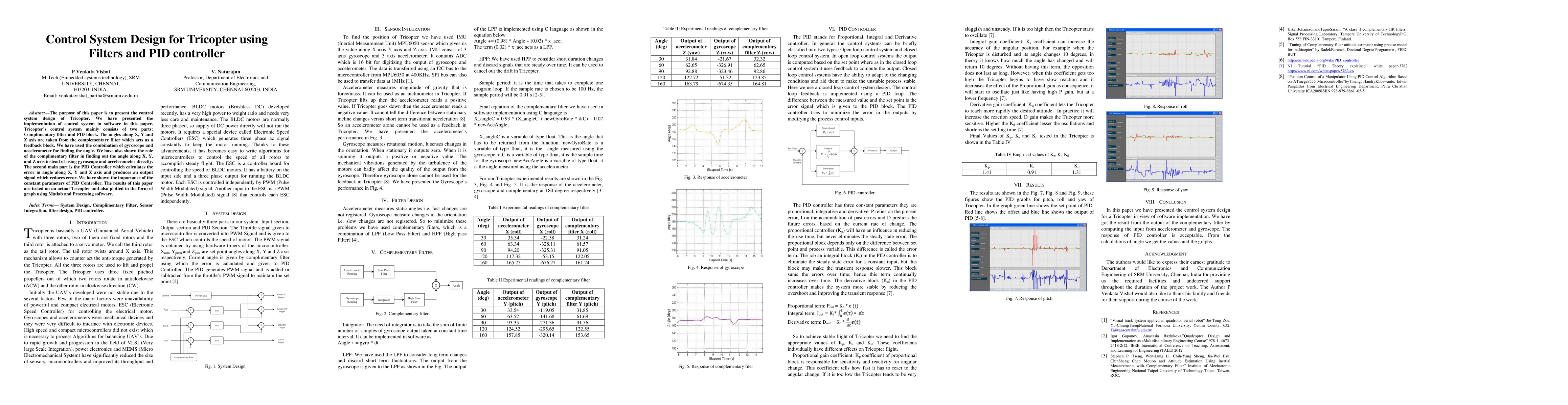 This paper details the control system design for a Tricopter using a complementary filter and a PID controller. The complementary filter integrates gyroscope and accelerometer data to determine angles, while the PID controller adjusts these angles by minimizing error, with results validated on an actual Tricopter and analyzed using Matlab and Processing software.