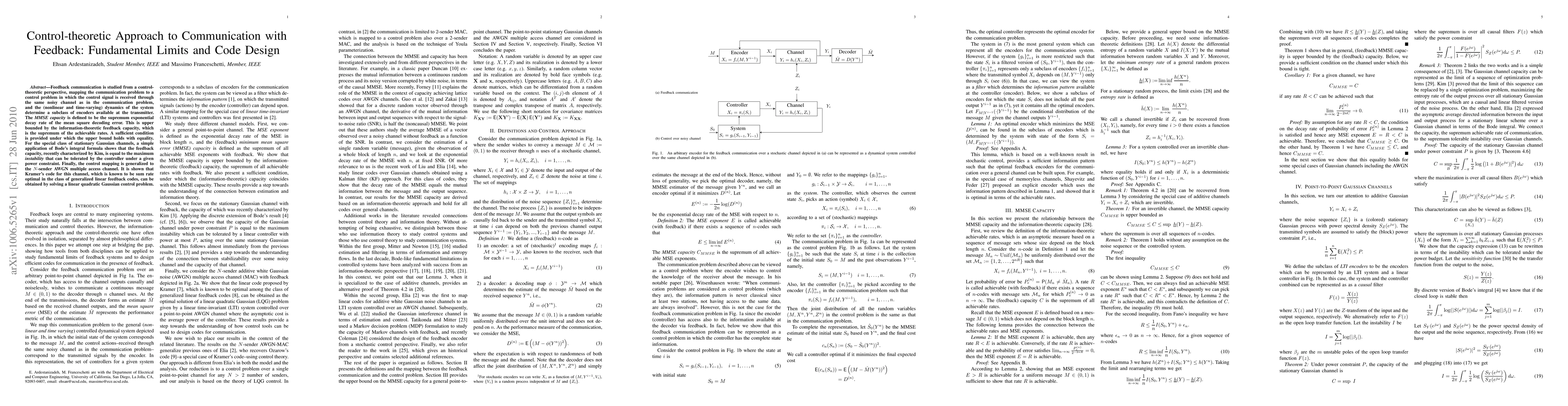 This paper explores feedback communication through a control-theoretic lens, mapping it to a control problem where the control signal traverses the same noisy channel. It defines MMSE capacity and relates it to the information-theoretic feedback capacity, showing that under certain conditions, these capacities are equal. For Gaussian channels, it connects feedback capacity to controller stability under power constraints.
