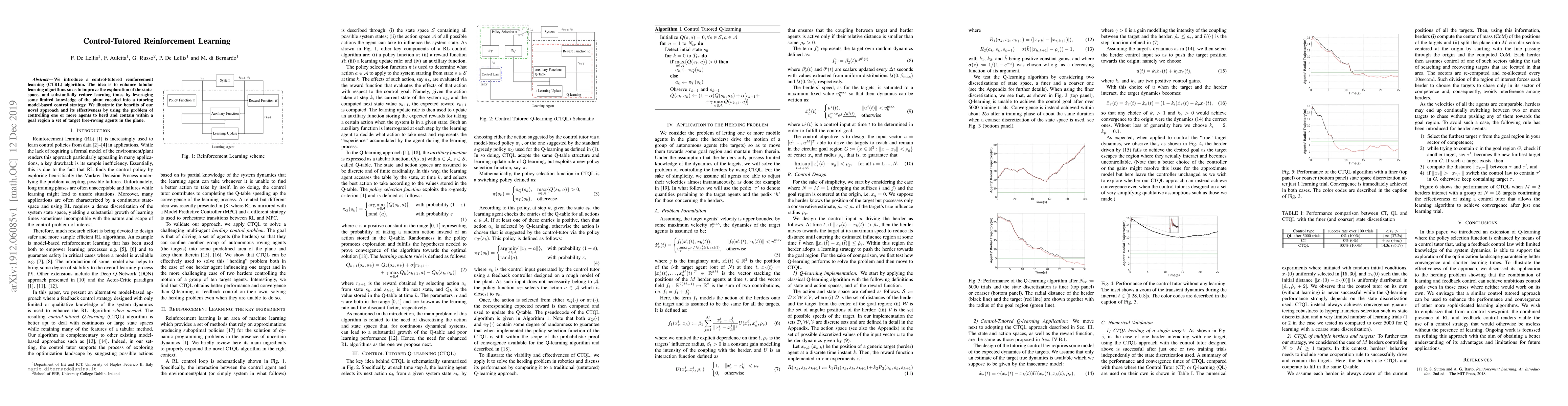 We introduce a control-tutored reinforcement learning (CTRL) algorithm. The idea is to enhance tabular learning algorithms so as to improve the exploration of the state-space, and substantially reduce learning times by leveraging some limited knowledge of the plant encoded into a tutoring model-based control strategy. We illustrate the benefits of our novel approach and its effectiveness by using the problem of controlling one or more agents to herd and contain within a goal region a set of target free-roving agents in the plane.