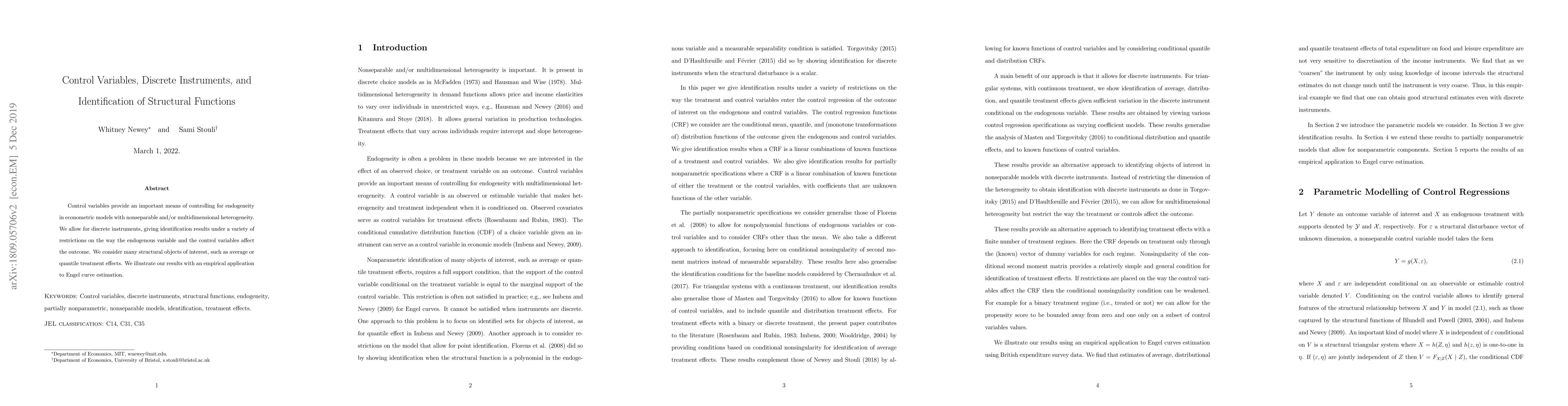 This paper explores the use of control variables to address endogeneity in econometric models, allowing for discrete instruments. It provides identification results under various restrictions and applies these methods to estimate structural functions, including average and quantile treatment effects, demonstrated through an empirical analysis of Engel curve estimation.