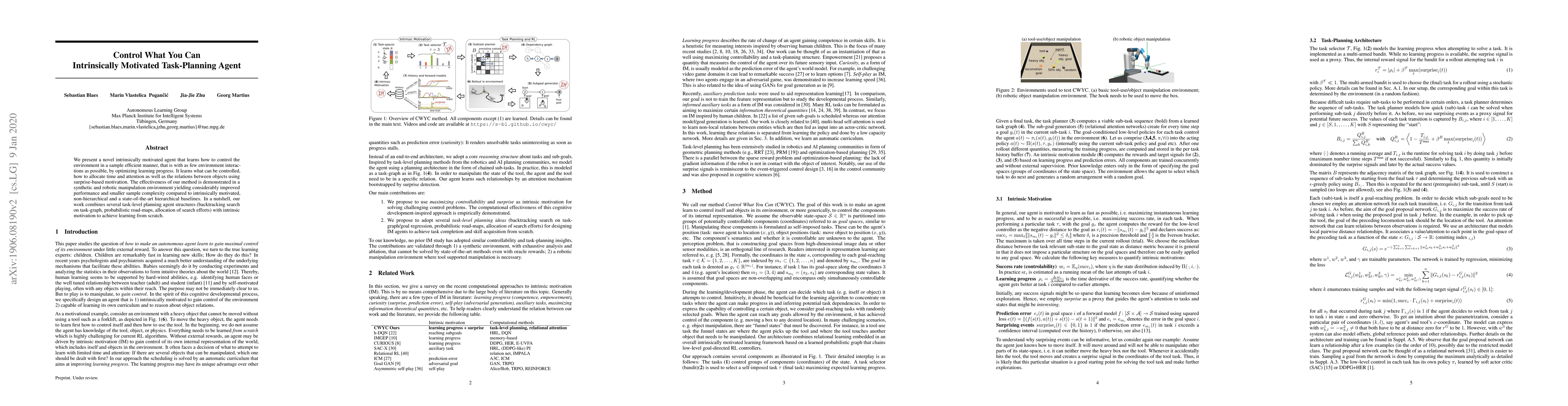 We present a novel intrinsically motivated agent that learns how to control the environment in the fastest possible manner by optimizing learning progress. It learns what can be controlled, how to allocate time and attention, and the relations between objects using surprise based motivation. The effectiveness of our method is demonstrated in a synthetic as well as a robotic manipulation environment yielding considerably improved performance and smaller sample complexity. In a nutshell, our work combines several task-level planning agent structures (backtracking search on task graph, probabilistic road-maps, allocation of search efforts) with intrinsic motivation to achieve learning from scratch.