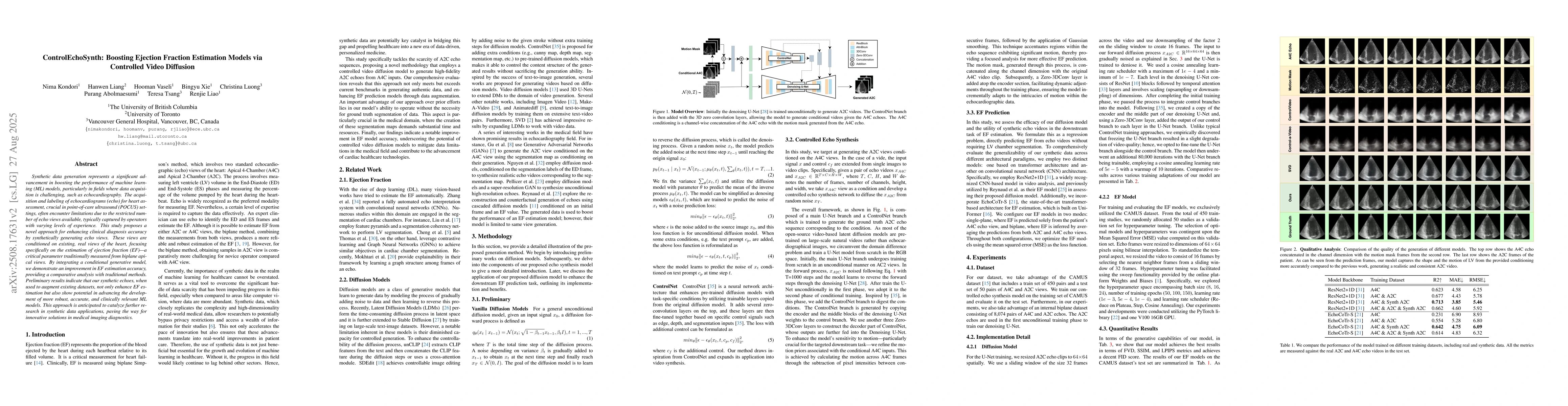 Synthetic data generation represents a significant advancement in boosting the performance of machine learning (ML) models, particularly in fields where data acquisition is challenging, such as echocardiography. The acquisition and labeling of echocardiograms (echo) for heart assessment, crucial in point-of-care ultrasound (POCUS) settings, often encounter limitations due to the restricted number of echo views available, typically captured by operators with varying levels of experience. This study proposes a novel approach for enhancing clinical diagnosis accuracy by synthetically generating echo views. These views are conditioned on existing, real views of the heart, focusing specifically on the estimation of ejection fraction (EF), a critical parameter traditionally measured from biplane apical views. By integrating a conditional generative model, we demonstrate an improvement in EF estimation accuracy, providing a comparative analysis with traditional methods. Preliminary results indicate that our synthetic echoes, when used to augment existing datasets, not only enhance EF estimation but also show potential in advancing the development of more robust, accurate, and clinically relevant ML models. This approach is anticipated to catalyze further research in synthetic data applications, paving the way for innovative solutions in medical imaging diagnostics.