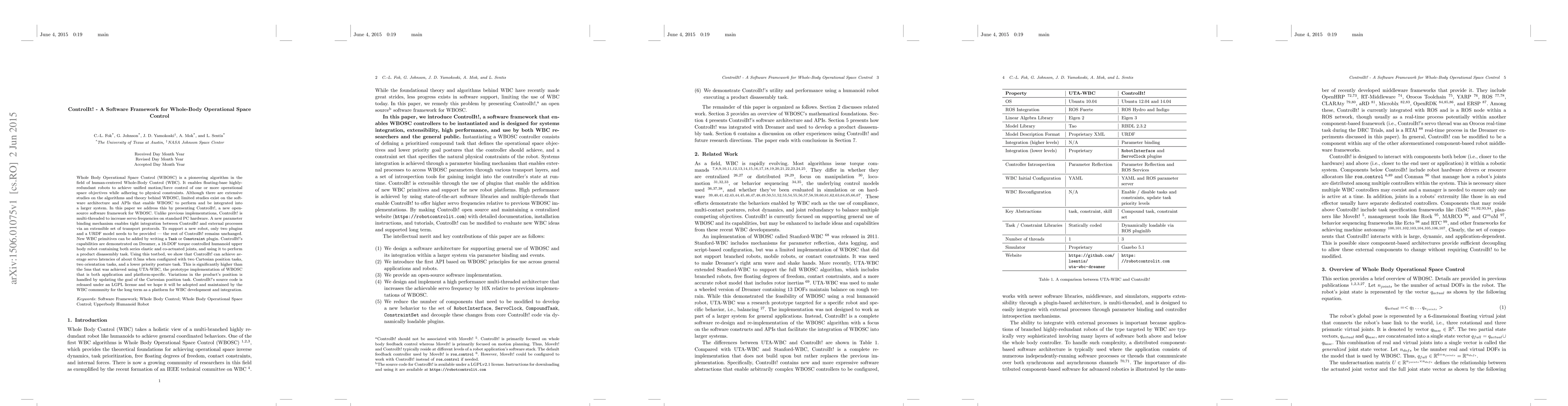 Researchers present ControlIt!, an open-source software framework for Whole-Body Operational Space Control that improves servo frequencies on PC hardware and allows easy integration with external processes.