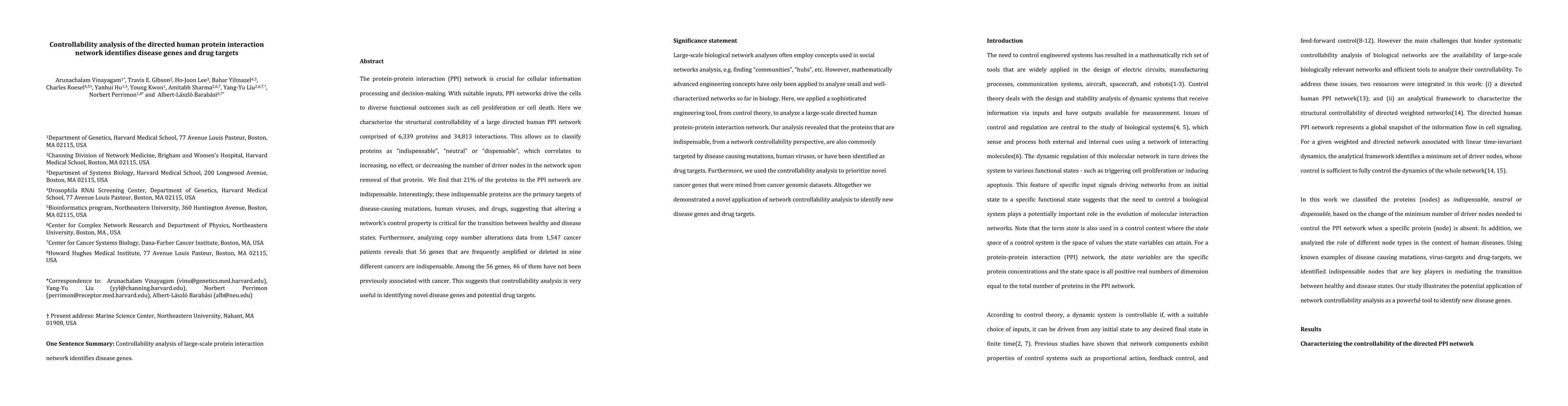 This study analyzes the controllability of a large human protein-protein interaction network, identifying 21% of proteins as indispensable for network control. These indispensable proteins are key targets for disease-causing mutations and drugs, highlighting their role in transitioning between healthy and disease states.