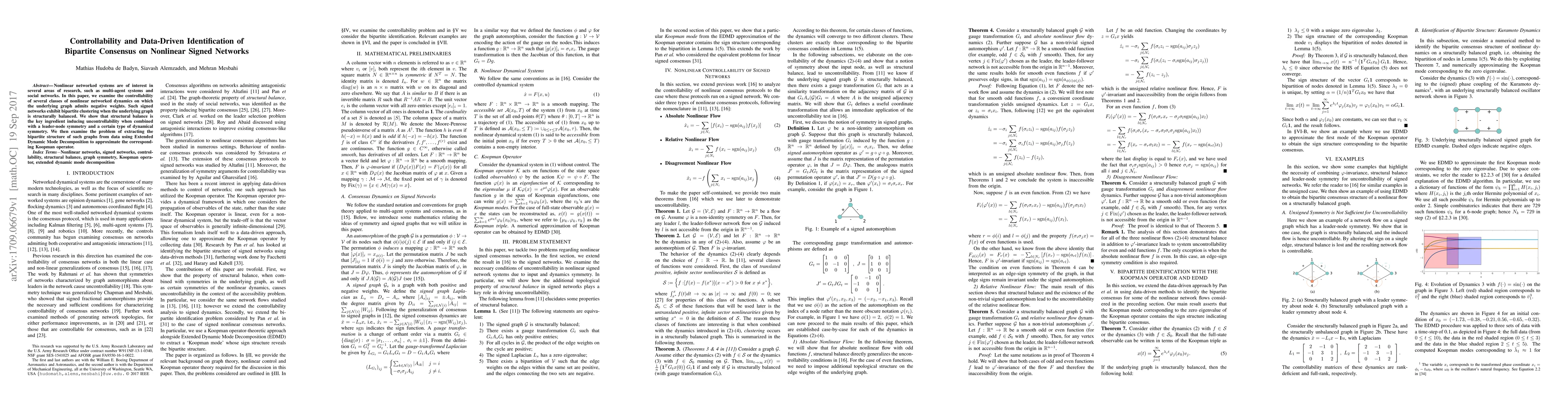 This paper investigates the controllability of nonlinear networked dynamics on signed graphs with negative weights, revealing that structural balance leads to uncontrollability under specific conditions. It also explores data-driven identification of bipartite consensus using Extended Dynamic Mode Decomposition to approximate the Koopman operator.