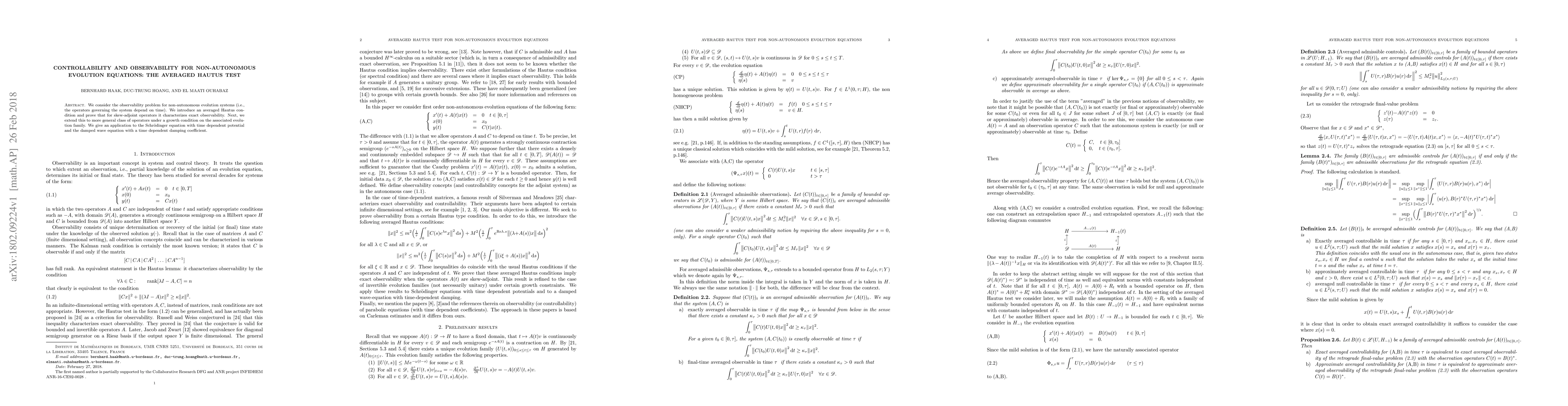 This paper introduces an averaged Hautus test to determine the observability of non-autonomous evolution systems, proving it characterizes exact observability for skew-adjoint operators. It extends this to a broader class of operators under a growth condition and applies the method to the Schrödinger equation and damped wave equation.