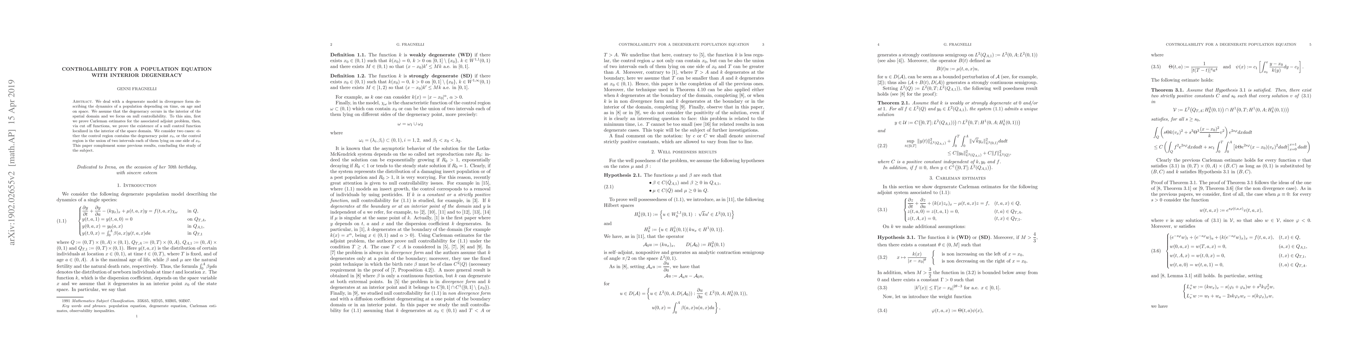 Researchers prove the existence of a null control function for a population model with interior degeneracy, resolving previous results in two specific cases where the control region contains or avoids the degeneracy point.