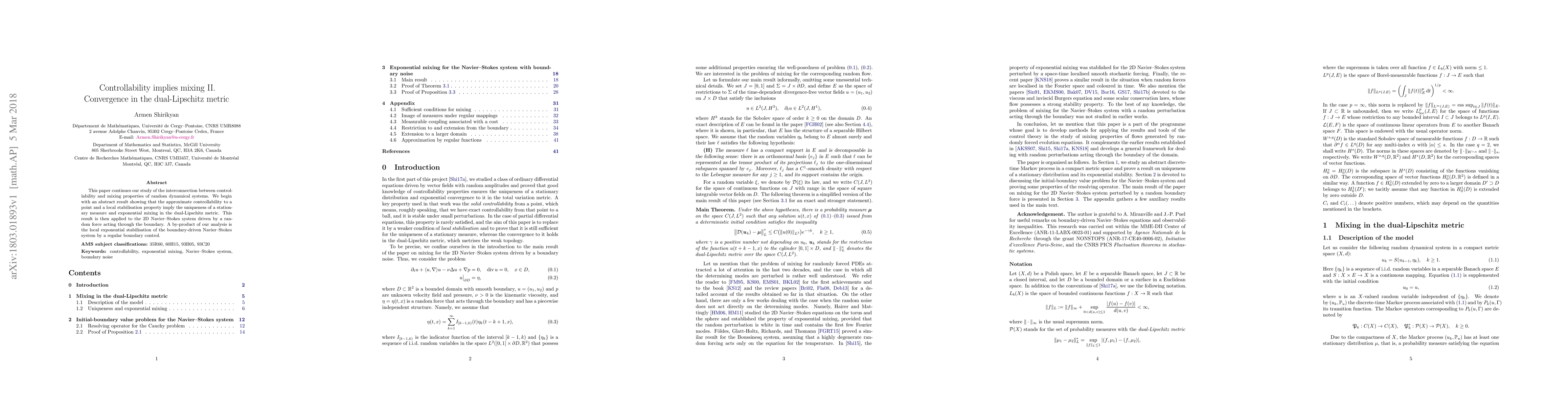 This paper demonstrates that approximate controllability and local stabilization imply the uniqueness of a stationary measure and exponential mixing in the dual-Lipschitz metric for random dynamical systems. It applies these findings to the 2D Navier-Stokes system, showing local exponential stabilization via boundary control.