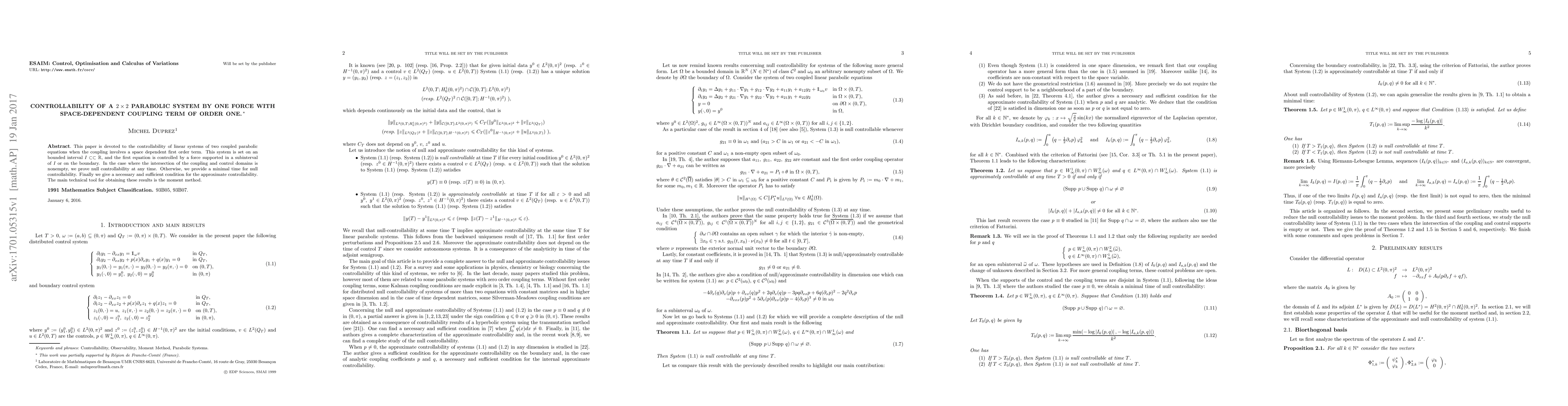 This paper investigates the controllability of a linear system of two coupled parabolic equations with a space-dependent first order coupling term. It proves null controllability when the coupling and control domains intersect, and provides a minimal time for controllability otherwise, using the moment method as the main technical tool.