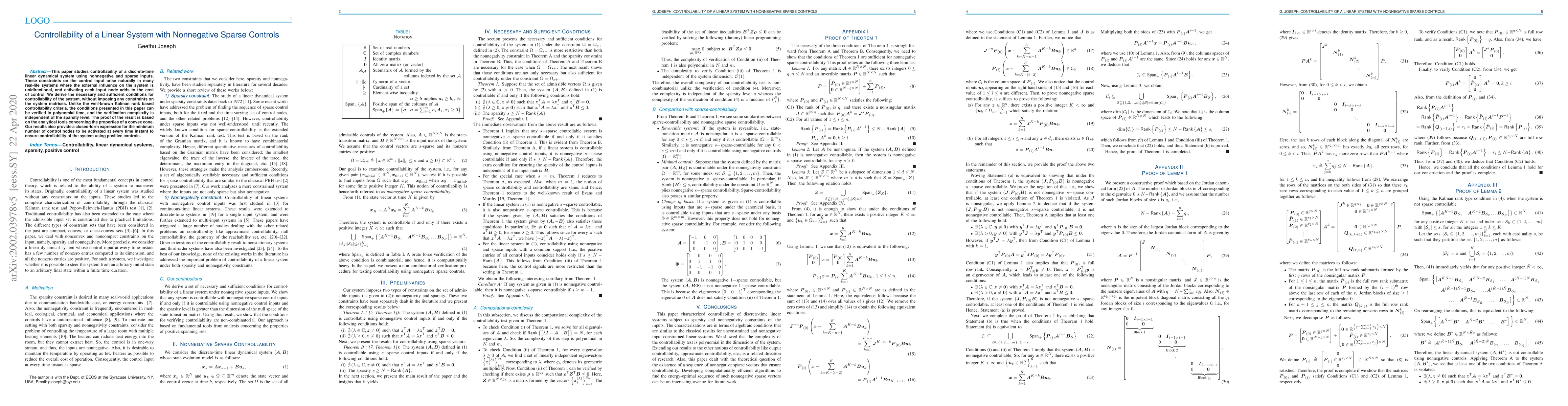 A study on controllability of linear systems with nonnegative sparse controls derives necessary conditions for controllability that can be verified in polynomial time, offering a closed-form expression for the minimum number of control nodes to activate for system controllability.