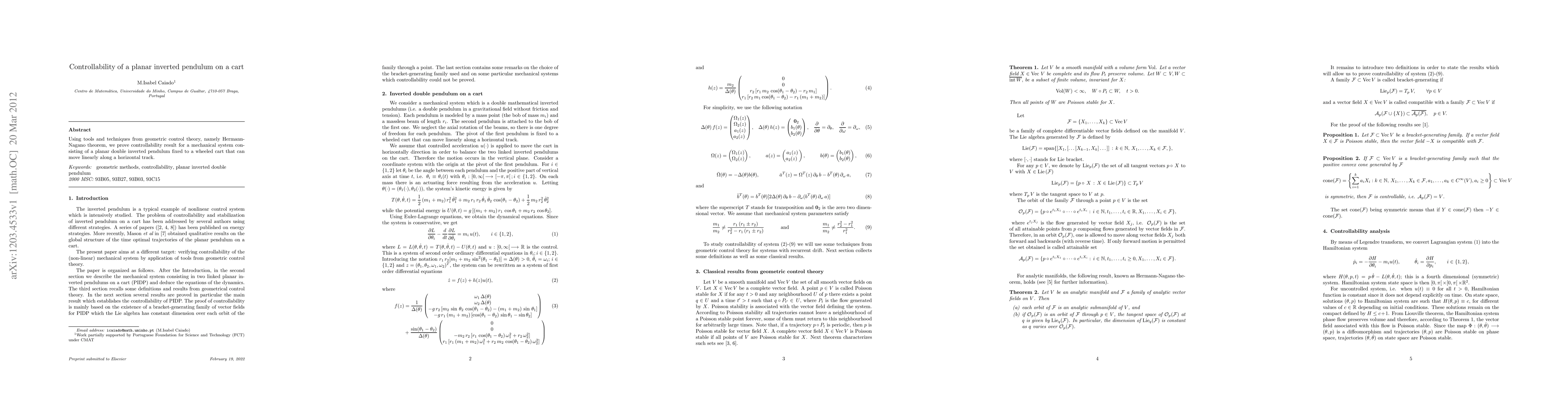 Summary: This paper utilizes geometric control theory, specifically the Hermann-Nagano theorem, to demonstrate the controllability of a mechanical system comprising a planar inverted pendulum attached to a wheeled cart that moves linearly on a horizontal track. The study establishes conditions under which the system can be maneuvered to any desired state.