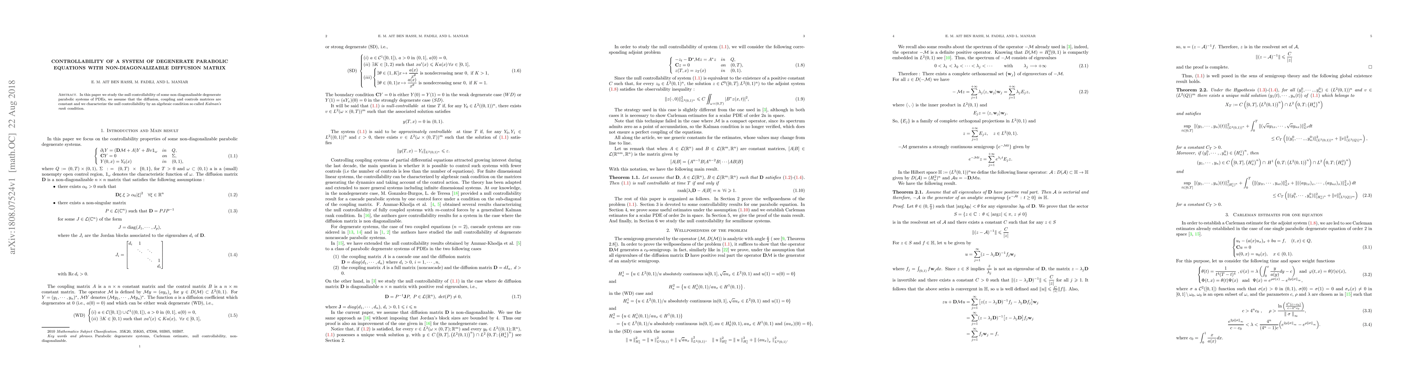 This paper investigates the null controllability of degenerate parabolic partial differential equations with non-diagonalizable diffusion matrices. It characterizes null controllability through an algebraic condition known as Kalman's rank condition.