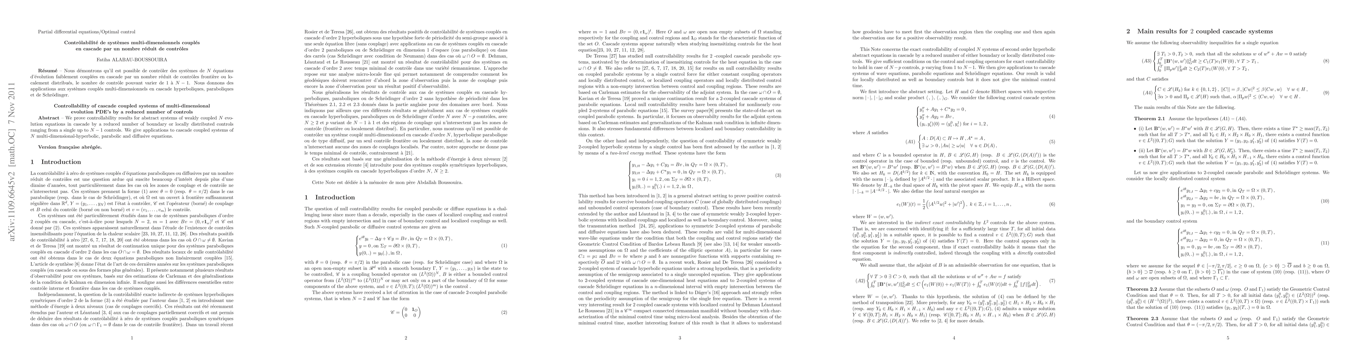 We prove controllability results for abstract systems of weakly coupled $N$ evolution equations in cascade by a reduced number of boundary or locally distributed controls ranging from a single up to $N-1$ controls. We give applications to cascade coupled systems of $N$ multi-dimensional-hyperbolic, parabolic and diffusive equations.