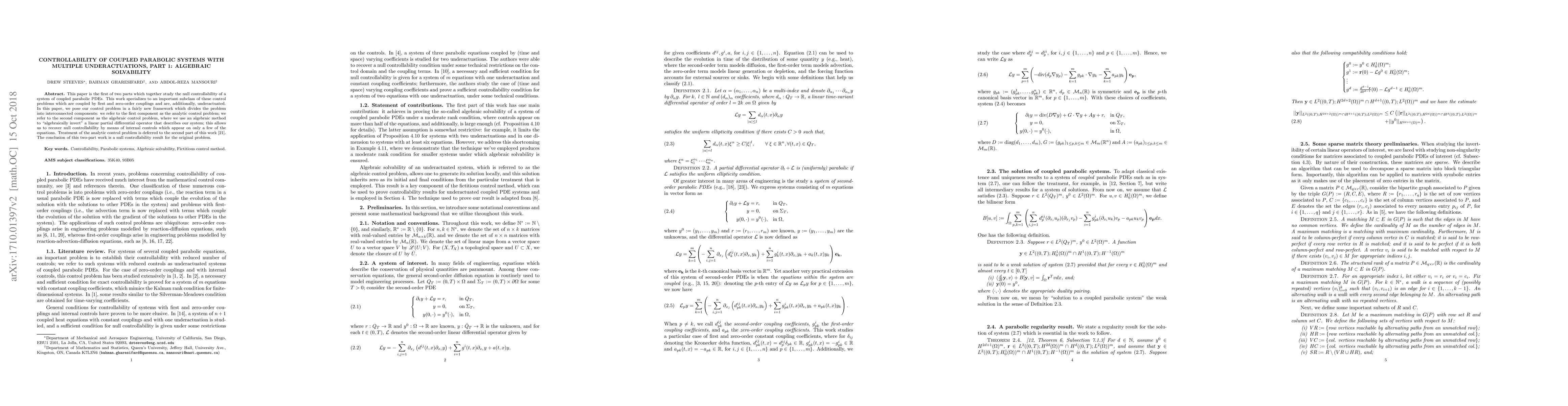 This work studies the null controllability of a system of coupled parabolic PDEs. In particular, our work specializes to an important subclass of these control problems which are coupled by first and zero-order couplings and are, additionally, underactuated. We pose our control problem in a fairly new framework which divides the problem into interconnected parts: we refer to the first part as the analytic control problem, where we use slightly non-classical techniques to prove null controllability by means of internal controls appearing on every equation; we refer to the second part as the algebraic control problem, where we use an algebraic method to invert a linear partial differential operator that describes our system; this allows us to recover null controllability by means of internal controls which appear on only a few of the equations. We establish a null controllability result for the original problem by solving these control problems concurrently.