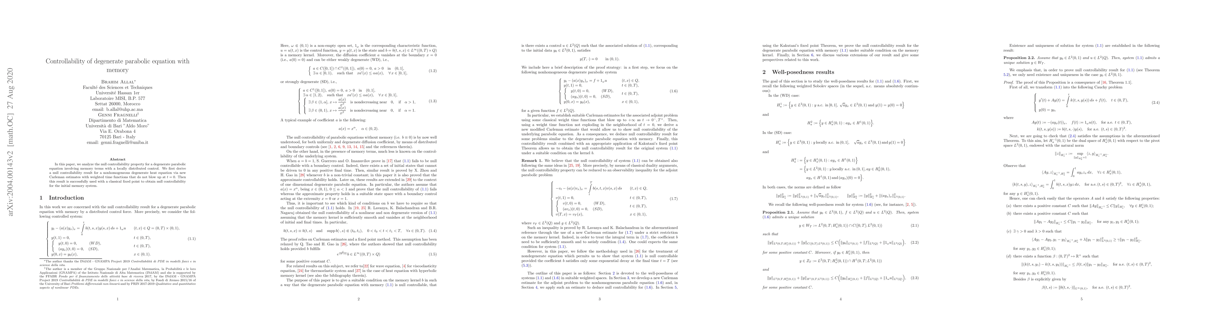 This paper investigates the null controllability of a degenerate parabolic equation with memory terms, deriving a result for a nonhomogeneous degenerate heat equation using new Carleman estimates. The findings are then applied to establish null controllability for the full memory system.