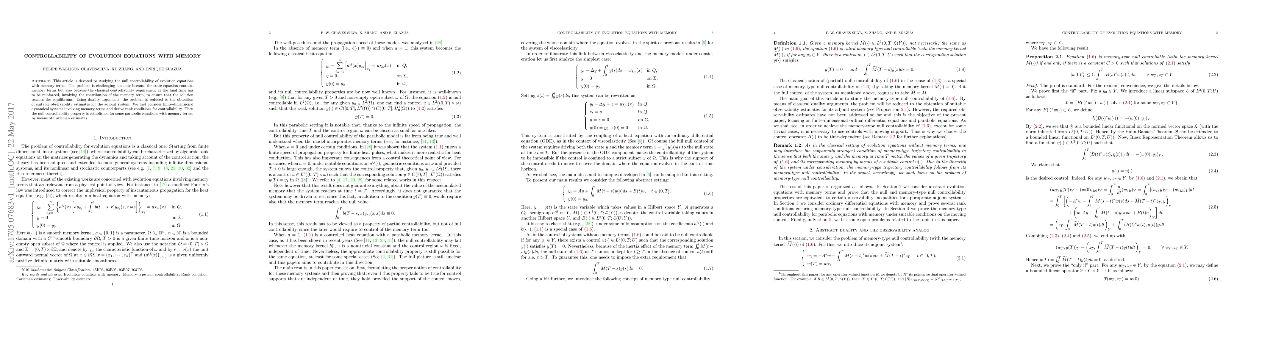 This paper investigates the null controllability of evolution equations with memory, employing duality and observability estimates. It establishes rank conditions for finite-dimensional systems and uses Carleman estimates to prove null controllability for certain parabolic equations.