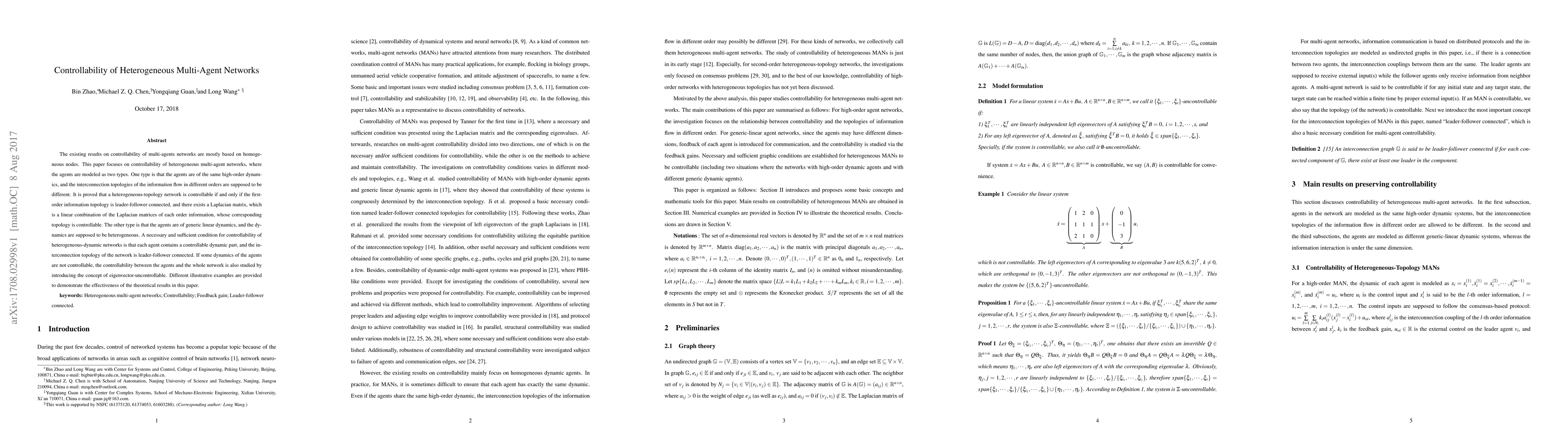 This paper investigates the controllability of heterogeneous multi-agent networks with different dynamics and interconnectivity topologies. It establishes conditions for controllability based on leader-follower connectivity and the existence of a controllable topology, with illustrative examples demonstrating the theoretical findings.