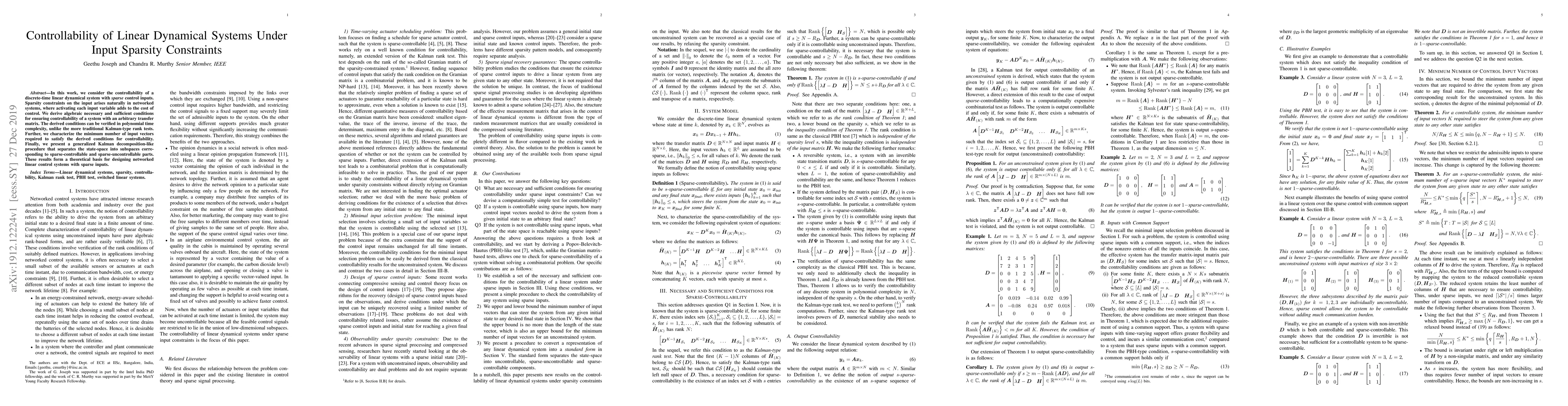 In this work, we consider the controllability of a discrete-time linear dynamical system with sparse control inputs. Sparsity constraints on the input arises naturally in networked systems, where activating each input variable adds to the cost of control. We derive algebraic necessary and sufficient conditions for ensuring controllability of a system with an arbitrary transfer matrix. The derived conditions can be verified in polynomial time complexity, unlike the more traditional Kalman-type rank tests. Further, we characterize the minimum number of input vectors required to satisfy the derived conditions for controllability. Finally, we present a generalized Kalman decomposition-like procedure that separates the state-space into subspaces corresponding to sparse-controllable and sparse-uncontrollable parts. These results form a theoretical basis for designing networked linear control systems with sparse inputs.