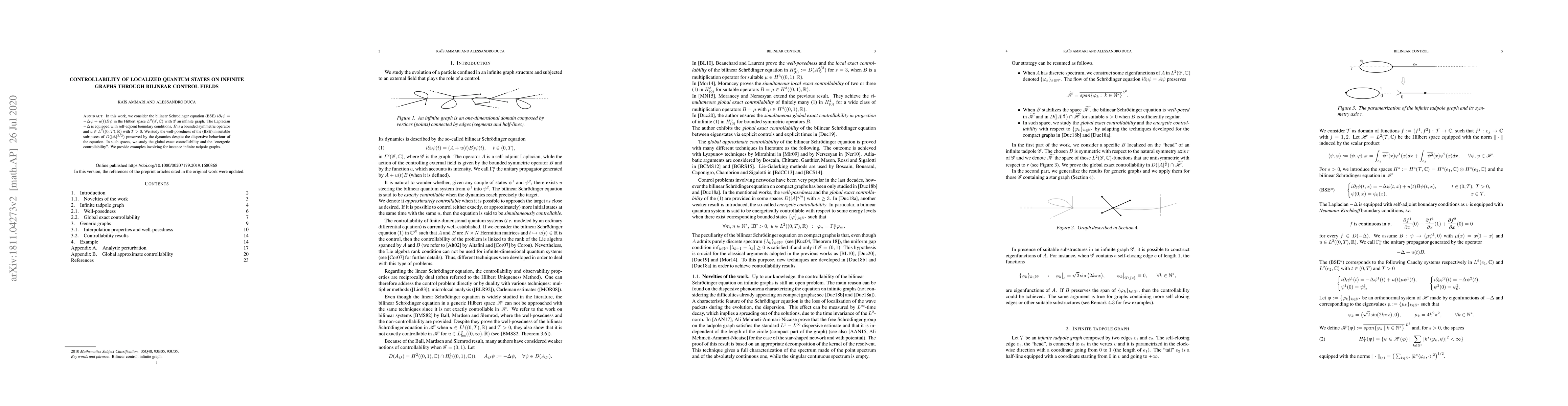 This paper investigates the controllability of localized quantum states on infinite graphs via bilinear control fields, focusing on the bilinear Schrödinger equation. It explores global exact and energetic controllability in suitable subspaces, providing examples on infinite tadpole graphs.