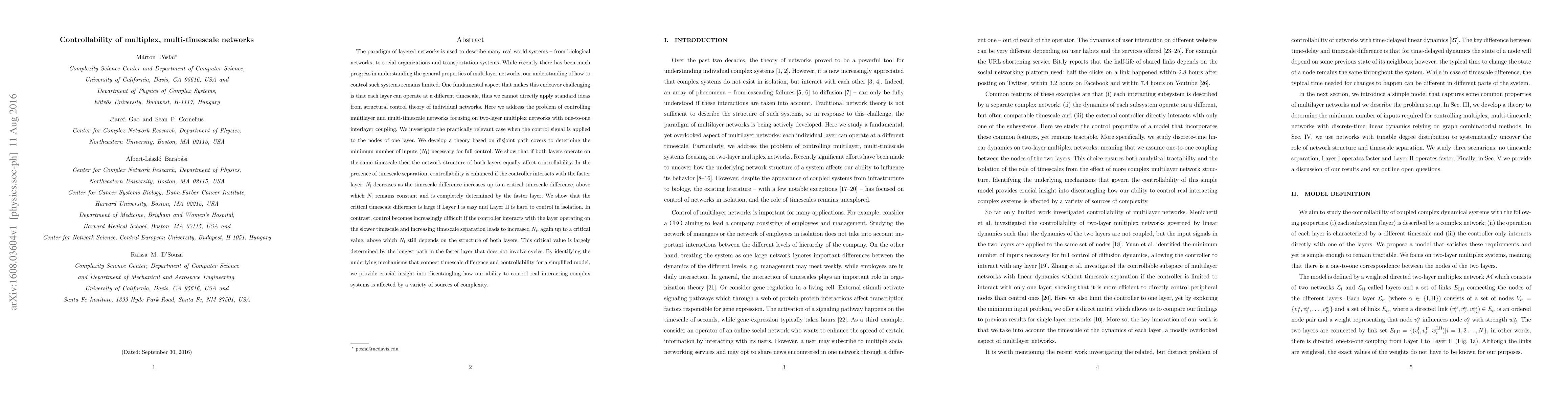 The paradigm of layered networks is used to describe many real-world systems -- from biological networks, to social organizations and transportation systems. Recently there has been much progress in understanding the general properties of multilayer networks, our understanding of how to control such systems remains limited. One aspect that makes this endeavor challenging is that each layer can operate at a different timescale, thus we cannot directly apply standard ideas from structural control theory of individual networks. Here we address the problem of controlling multilayer and multi-timescale networks focusing on two-layer multiplex networks with one-to-one interlayer coupling. We investigate the case when the control signal is applied to the nodes of one layer. We develop a theory based on disjoint path covers to determine the minimum number of inputs ($N_\T i$) necessary for full control. We show that if both layers operate on the same timescale then the network structure of both layers equally affect controllability. In the presence of timescale separation, controllability is enhanced if the controller interacts with the faster layer: $N_\T i$ decreases as the timescale difference increases up to a critical timescale difference, above which $N_\T i$ remains constant and is completely determined by the faster layer. In contrast, control becomes increasingly difficult if the controller interacts with the layer operating on the slower timescale and increasing timescale separation leads to increased $N_\T i$, again up to a critical value, above which $N_\T i$ still depends on the structure of both layers. By identifying the underlying mechanisms that connect timescale difference and controllability for a simplified model, we provide insight into disentangling how our ability to control real interacting complex systems is affected by a variety of sources of complexity.