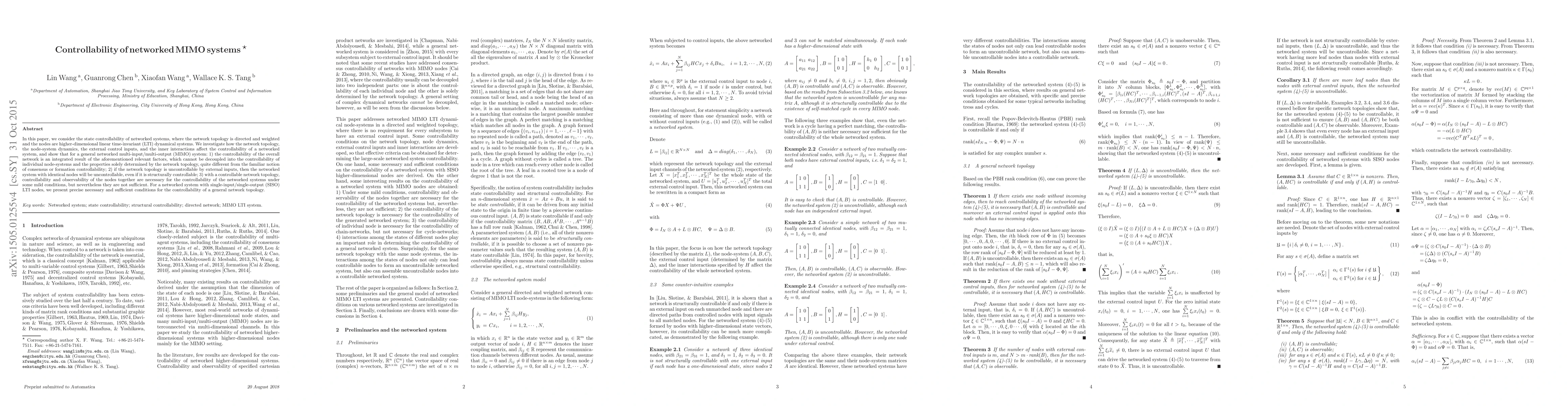 This paper explores the controllability of networked MIMO systems, emphasizing that the overall network's controllability is a complex integration of network topology, node dynamics, external inputs, and inner interactions, and cannot be simply attributed to individual nodes or network topology alone. It also highlights that a structurally controllable network with uncontrollable topology can still be uncontrollable if nodes are identical.