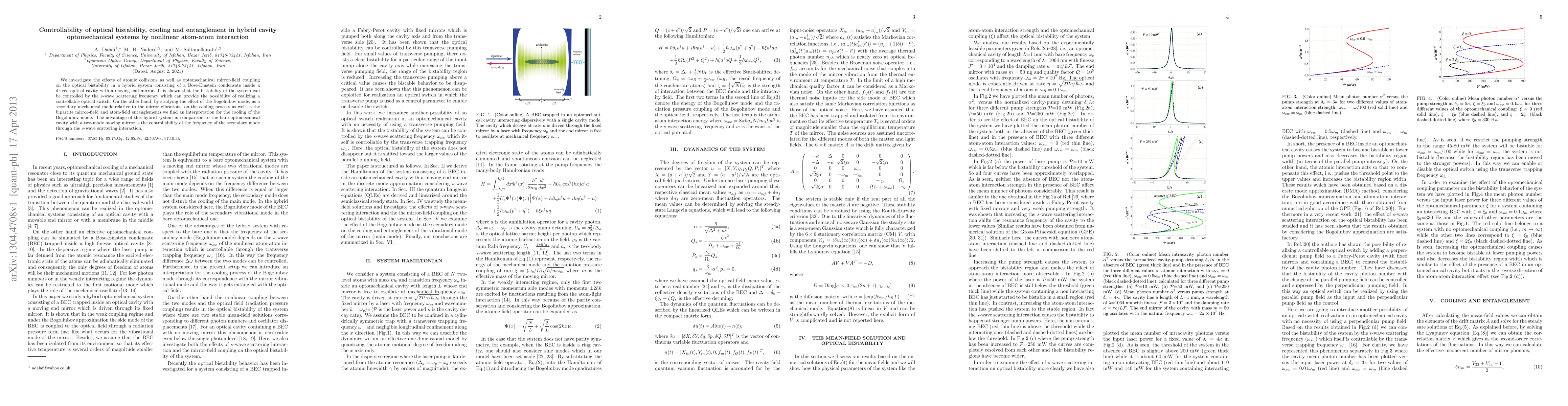 We investigate the effects of atomic collisions as well as optomechanical mirror-field coupling on the optical bistability in a hybrid system consisting of a Bose-Einstein condensate inside a driven optical cavity with a moving end mirror. It is shown that the bistability of the system can be controlled by the s-wave scattering frequency which can provide the possibility of realizing a controllable optical switch. On the other hand, by studying the effect of the Bogoliubov mode, as a secondary mechanical mode relative to the mirror vibrations, on the cooling process as well as the bipartite mirror-field and atom-field entanglements we find an interpretation for the cooling of the Bogoliubov mode. The advantage of this hybrid system in comparison to the bare optomecanical cavity with a two-mode moving mirror is the controllability of the frequency of the secondary mode through the s-wave scattering interaction.