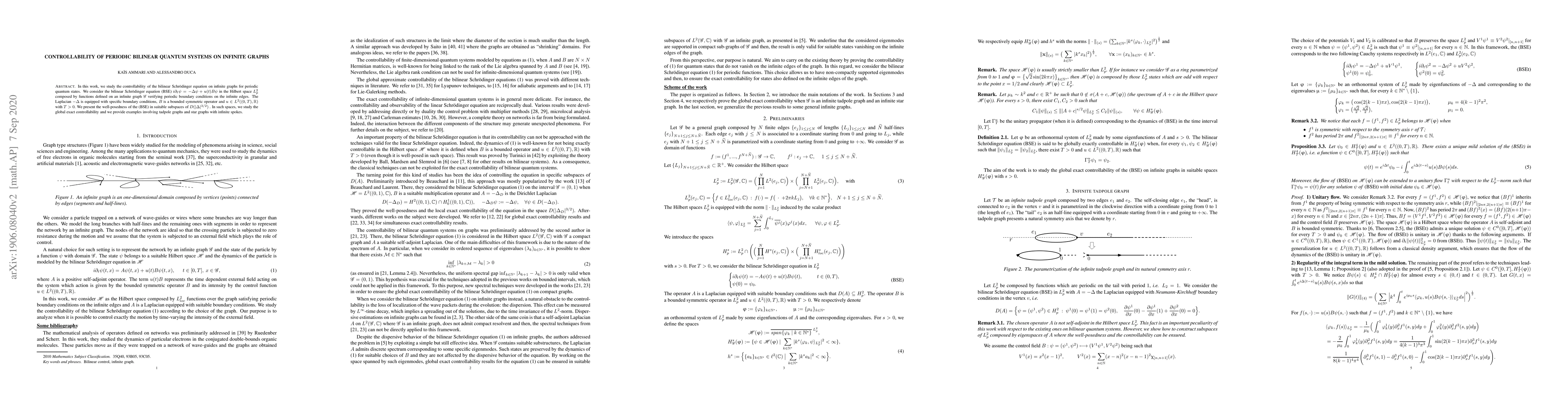 This paper investigates the controllability of periodic bilinear quantum systems described by the bilinear Schrödinger equation on infinite graphs. It establishes the well-posedness of the system in suitable function spaces and demonstrates global exact controllability, illustrated through examples on tadpole and star graphs.
