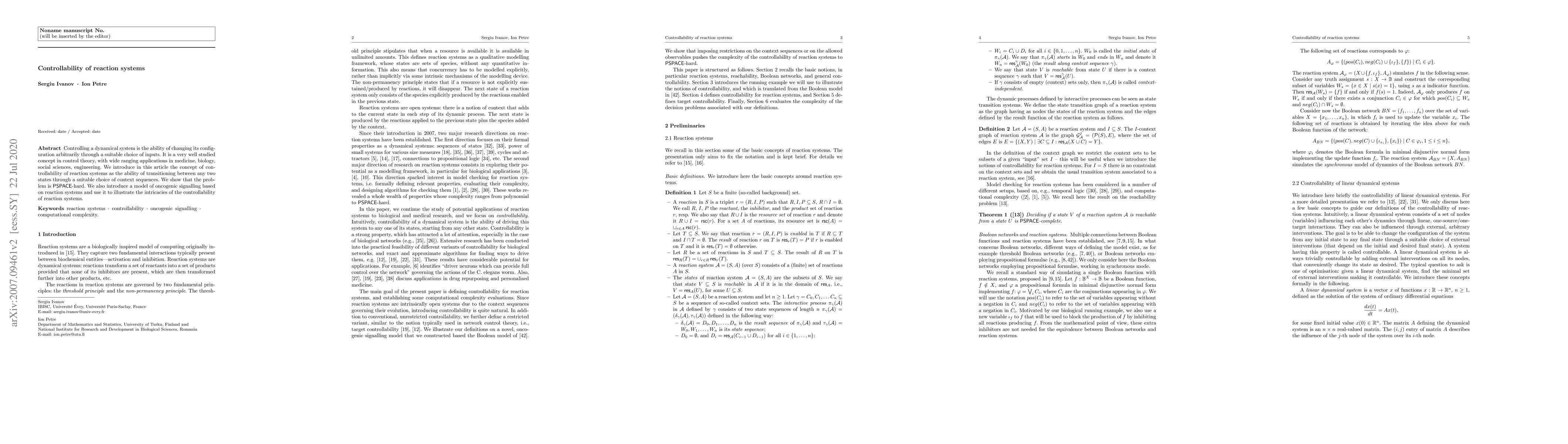Researchers introduce a new concept for controlling reaction systems, showing it is PSPACE-hard to transition between any two states with suitable input sequences. This problem has implications for understanding oncogenic signalling in biology.