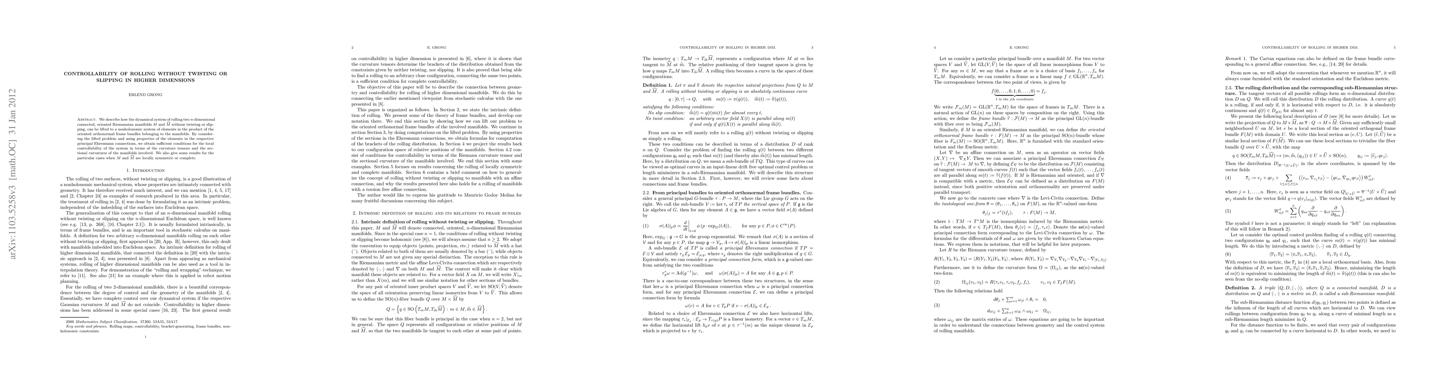 This paper explores the controllability of rolling dynamics for $n$-dimensional Riemannian manifolds without twisting or slipping, lifting the problem to a nonholonomic system. It provides sufficient conditions for local controllability based on curvature tensors and sectional curvatures, with specific results for locally symmetric or complete manifolds.
