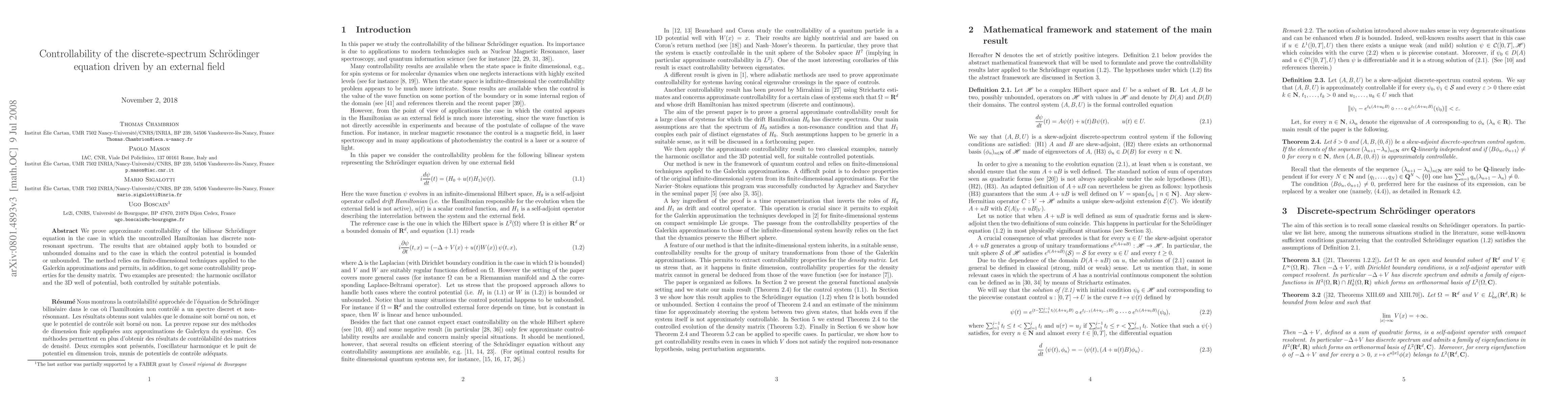 We prove approximate controllability of the bilinear Schr\"odinger equation in the case in which the uncontrolled Hamiltonian has discrete non-resonant spectrum. The results that are obtained apply both to bounded or unbounded domains and to the case in which the control potential is bounded or unbounded. The method relies on finite-dimensional techniques applied to the Galerkin approximations and permits, in addition, to get some controllability properties for the density matrix. Two examples are presented: the harmonic oscillator and the 3D well of potential, both controlled by suitable potentials.