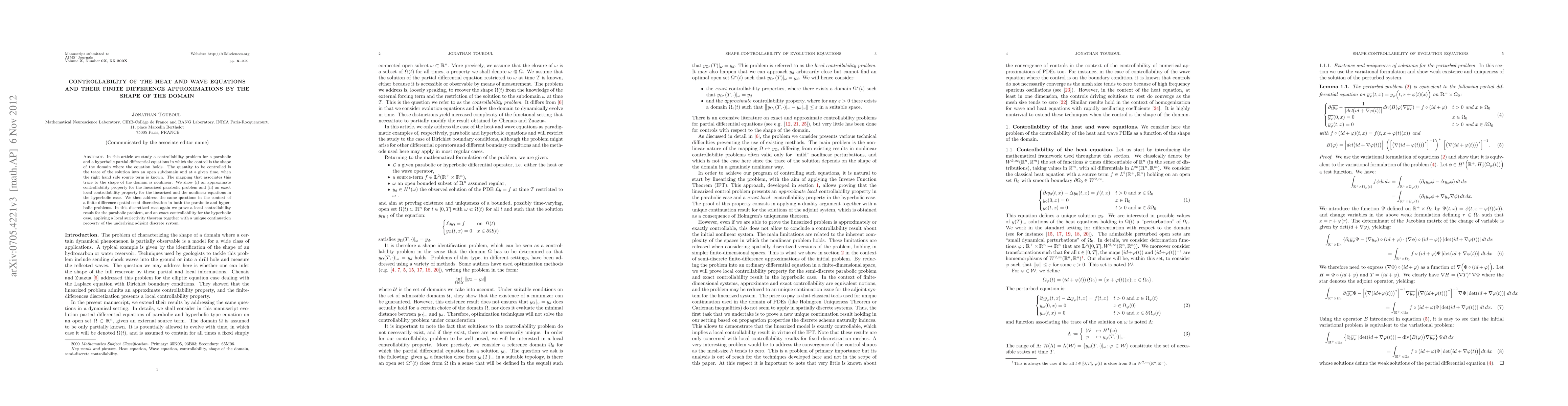 In this article we study a controllability problem for a parabolic and a hyperbolic partial differential equations in which the control is the shape of the domain where the equation holds. The quantity to be controlled is the trace of the solution into an open subdomain and at a given time, when the right hand side source term is known. The mapping that associates this trace to the shape of the domain is nonlinear. We show (i) an approximate controllability property for the linearized parabolic problem and (ii) an exact local controllability property for the linearized and the nonlinear equations in the hyperbolic case. We then address the same questions in the context of a finite difference spatial semi-discretization in both the parabolic and hyperbolic problems. In this discretized case again we prove a local controllability result for the parabolic problem, and an exact controllability for the hyperbolic case, applying a local surjectivity theorem together with a unique continuation property of the underlying adjoint discrete system.