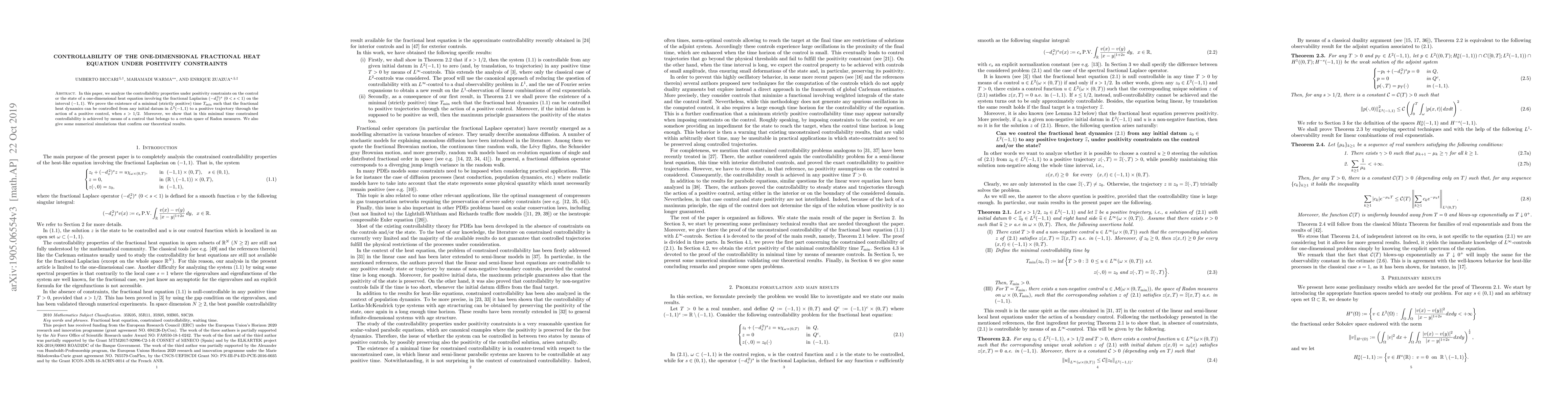 This paper examines the controllability of a one-dimensional fractional heat equation with positivity constraints on the control or state, showing that for $s>1/2$, a minimal time $T_{\rm min}$ exists to steer the system from any initial state to a positive trajectory using a positive control. Numerical simulations validate the theoretical findings.