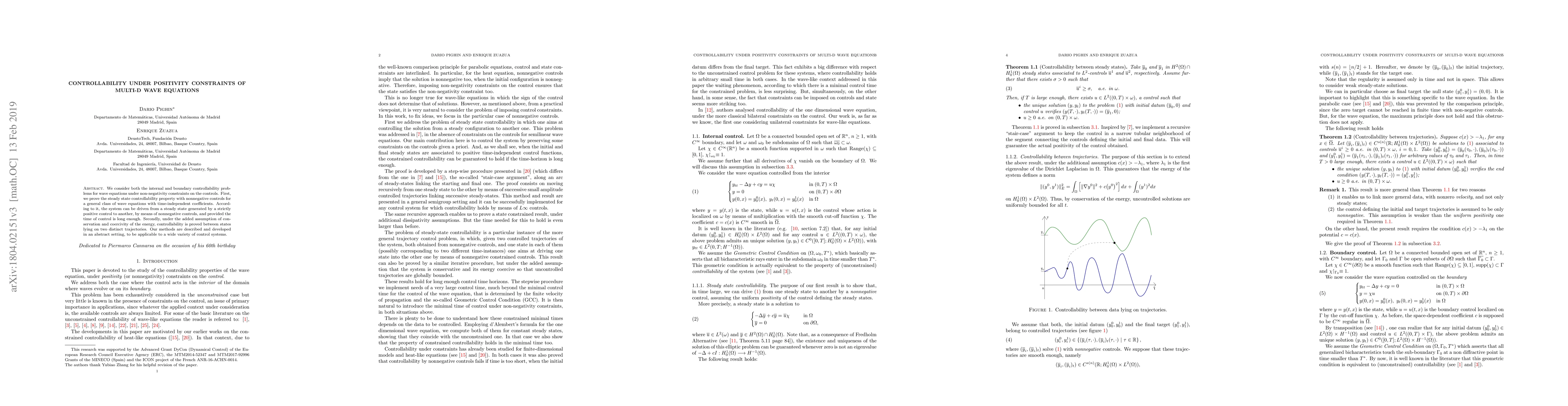 This paper investigates the controllability of multi-dimensional wave equations under non-negative control constraints. It proves steady state controllability for a general class of wave equations and extends this to controllability between distinct trajectories under additional energy conservation and coercivity assumptions.