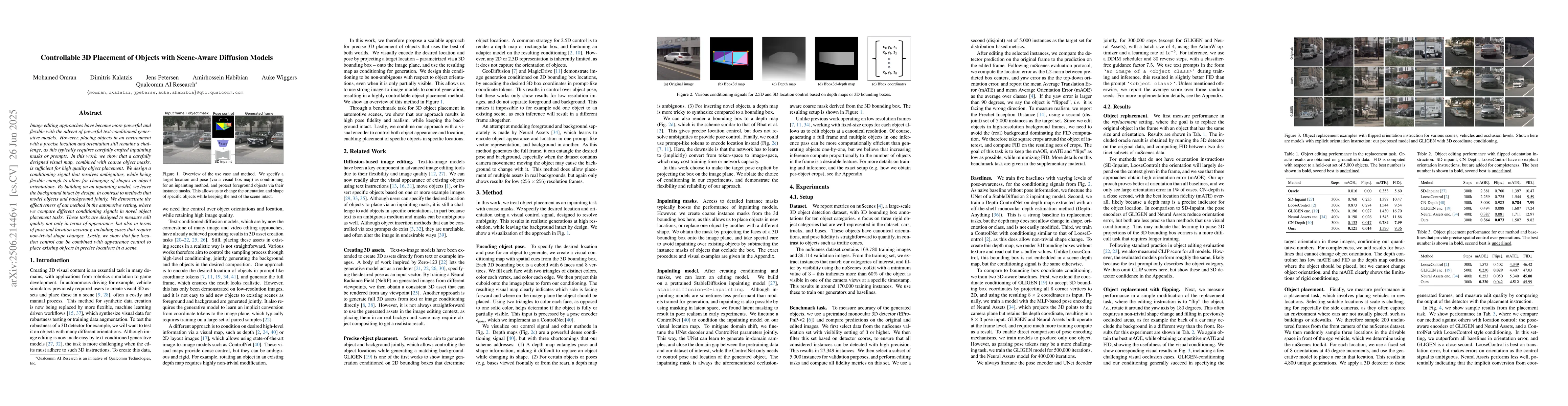 Image editing approaches have become more powerful and flexible with the advent of powerful text-conditioned generative models. However, placing objects in an environment with a precise location and orientation still remains a challenge, as this typically requires carefully crafted inpainting masks or prompts. In this work, we show that a carefully designed visual map, combined with coarse object masks, is sufficient for high quality object placement. We design a conditioning signal that resolves ambiguities, while being flexible enough to allow for changing of shapes or object orientations. By building on an inpainting model, we leave the background intact by design, in contrast to methods that model objects and background jointly. We demonstrate the effectiveness of our method in the automotive setting, where we compare different conditioning signals in novel object placement tasks. These tasks are designed to measure edit quality not only in terms of appearance, but also in terms of pose and location accuracy, including cases that require non-trivial shape changes. Lastly, we show that fine location control can be combined with appearance control to place existing objects in precise locations in a scene.