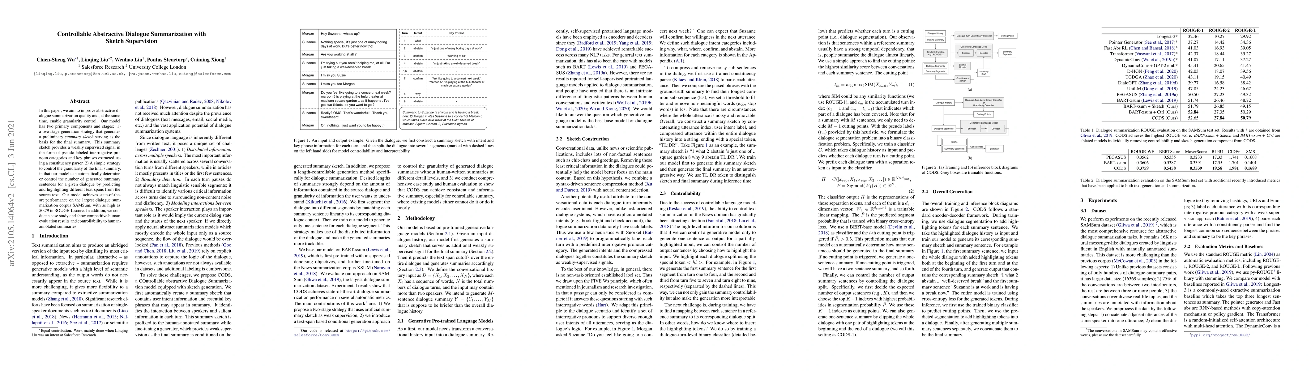 This paper presents a model for controllable abstractive dialogue summarization, utilizing sketch supervision to generate preliminary summaries and enabling fine-grained control over summary length. The model achieves top performance on the SAMSum dataset and demonstrates effective granularity control and competitive human evaluation results.