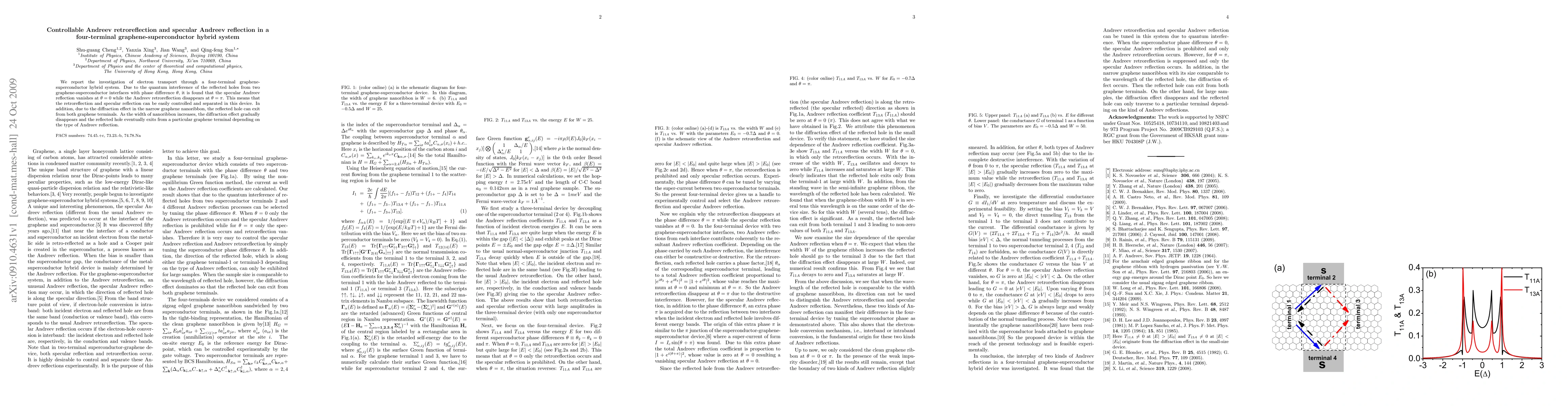 This study investigates electron transport in a four-terminal graphene-superconductor hybrid system, demonstrating controllable Andreev retroreflection and specular Andreev reflection. The system allows for the separation of retroreflection and specular reflection by adjusting the phase difference, with retroreflection vanishing at $\theta=0$ and specular reflection at $\theta=\pi$.