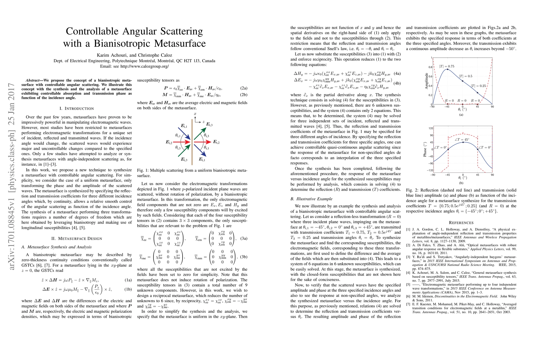 Summary: This paper introduces a bianisotropic metasurface capable of controlling angular scattering, demonstrating its ability to adjust absorption and transmission phase based on the angle of incidence through synthesis and analysis.