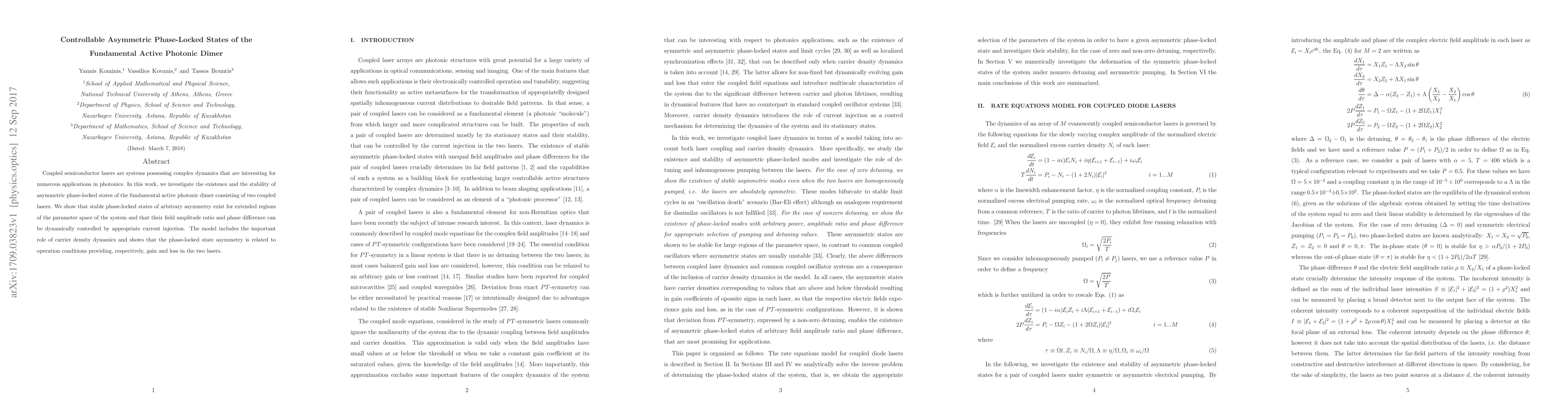 Coupled semiconductor lasers are systems possessing complex dynamics that are interesting for numerous applications in photonics. In this work, we investigate the existence and the stability of asymmetric phase-locked states of the fundamental active photonic dimer consisting of two coupled lasers. We show that stable phase-locked states of arbitrary asymmetry exist for extended regions of the parameter space of the system and that their field amplitude ratio and phase difference can be dynamically controlled by appropriate current injection. The model includes the important role of carrier density dynamics and shows that the phase-locked state asymmetry is related to operation conditions providing, respectively, gain and loss in the two lasers.