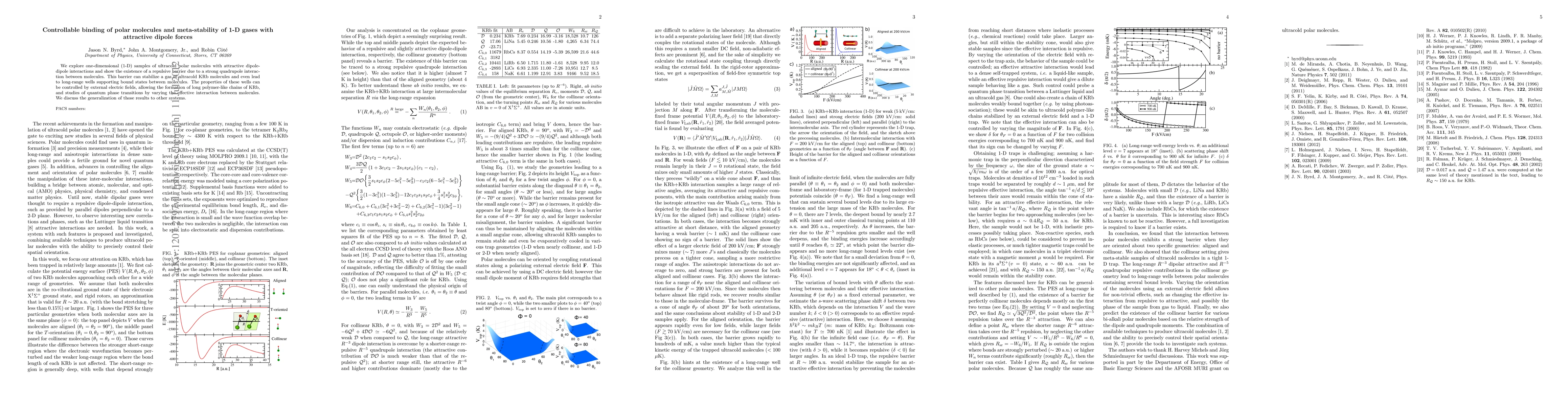 We explore one-dimensional (1-D) samples of ultracold polar molecules with attractive dipole-dipole interactions and show the existence of a repulsive barrier due to a strong quadrupole interaction between molecules. This barrier can stabilize a gas of ultracold KRb molecules and even lead to long-range wells supporting bound states between molecules. The properties of these wells can be controlled by external electric fields, allowing the formation of long polymer-like chains of KRb, and studies of quantum phase transitions by varying the effective interaction between molecules. We discuss the generalization of those results to other systems.